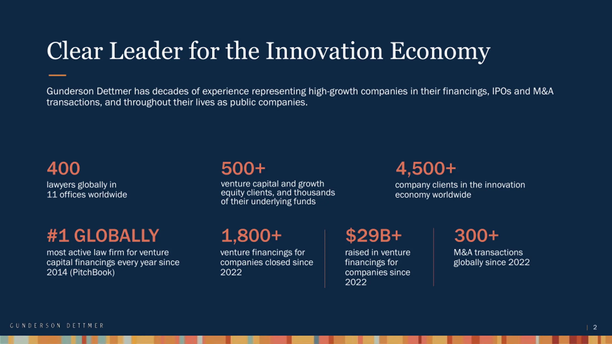 Clear Leader for the Innovation Economy Gunderson Dettmer has decades of experience representing high-growth companies in their financings, IPOs and M&A transactions, and throughout their lives as public companies. 400 lawyers globally in 11 offices worldwide 500+ venture capital and growth equity clients, and thousands of their underlying funds 4,500+ company clients in the innovation economy worldwide #1 GLOBALLY most active law firm for venture capital financings every year since 2014 (PitchBook) 1,800+ venture financings for companies closed since 2022 $29B+ 300+ raised in venture financings for companies since 2022 M&A transactions globally since 2022 2
