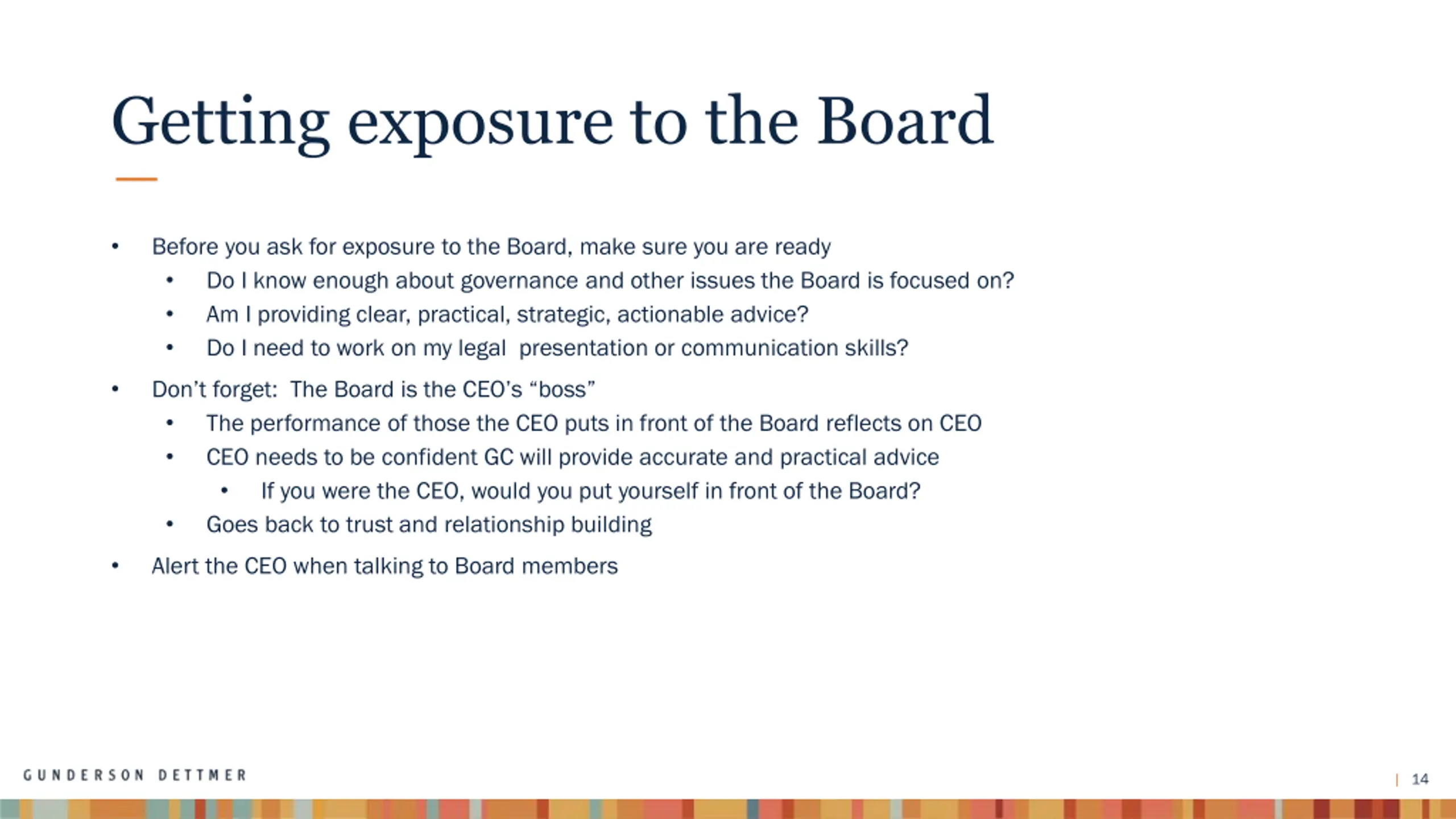 Getting exposure to the Board Don t seek exposure for the sake of exposure In very early-stage companies, legal may not be central to the company s strategy or development. For GCs that don t have corporate background, the outside law firm s corporate partner or senior associate will likely have skills that are more relevant to the Board, e.g., experience with venture financing, IPOs, M&A, governance and disclosure Ask outside counsel to help you learn in areas where you have less experience Let them know you are working toward providing more of the legal advice a Board meetings There may not be any issues that require the active participation of in-house legal other than documenting Board activities thru the minutes There is a governance role for lawyers in the Board room Minutes, Board and stockholder governance matters If the GC is in the room, GC will be expected to competently address the Board s governance questions If there are legal or compliance issues that require Board level discussion, GCs should advocate to lead that discussion 13