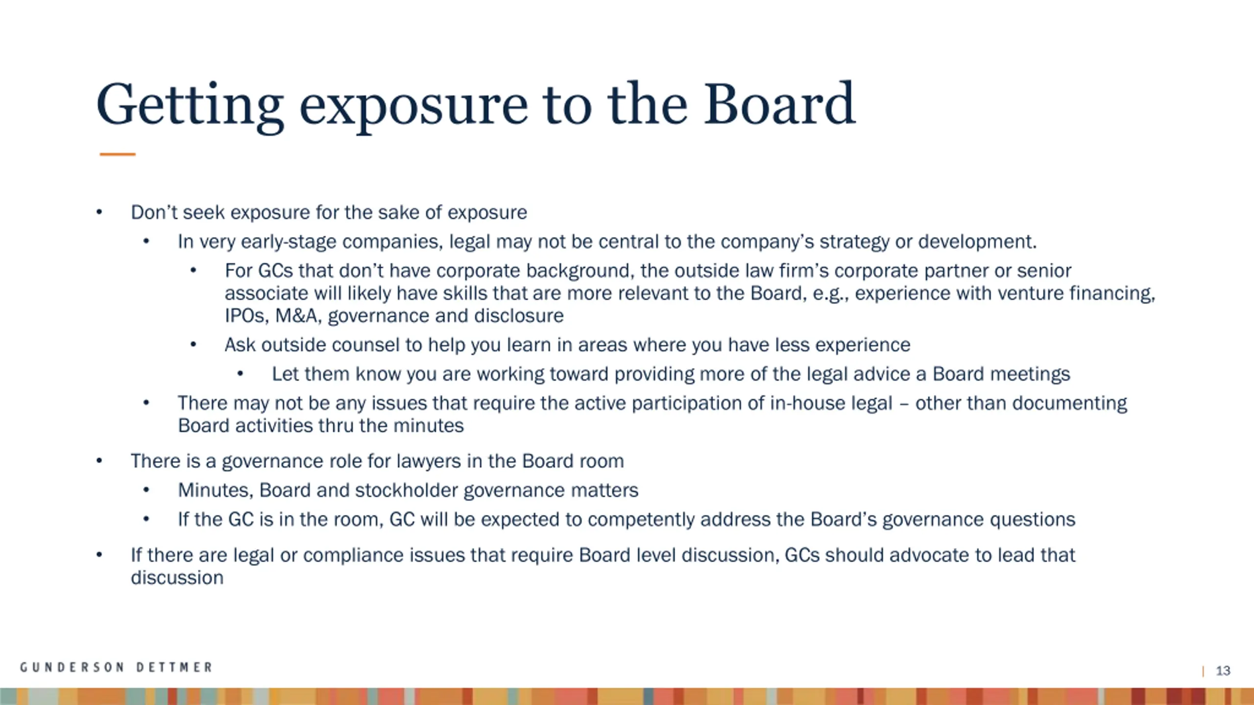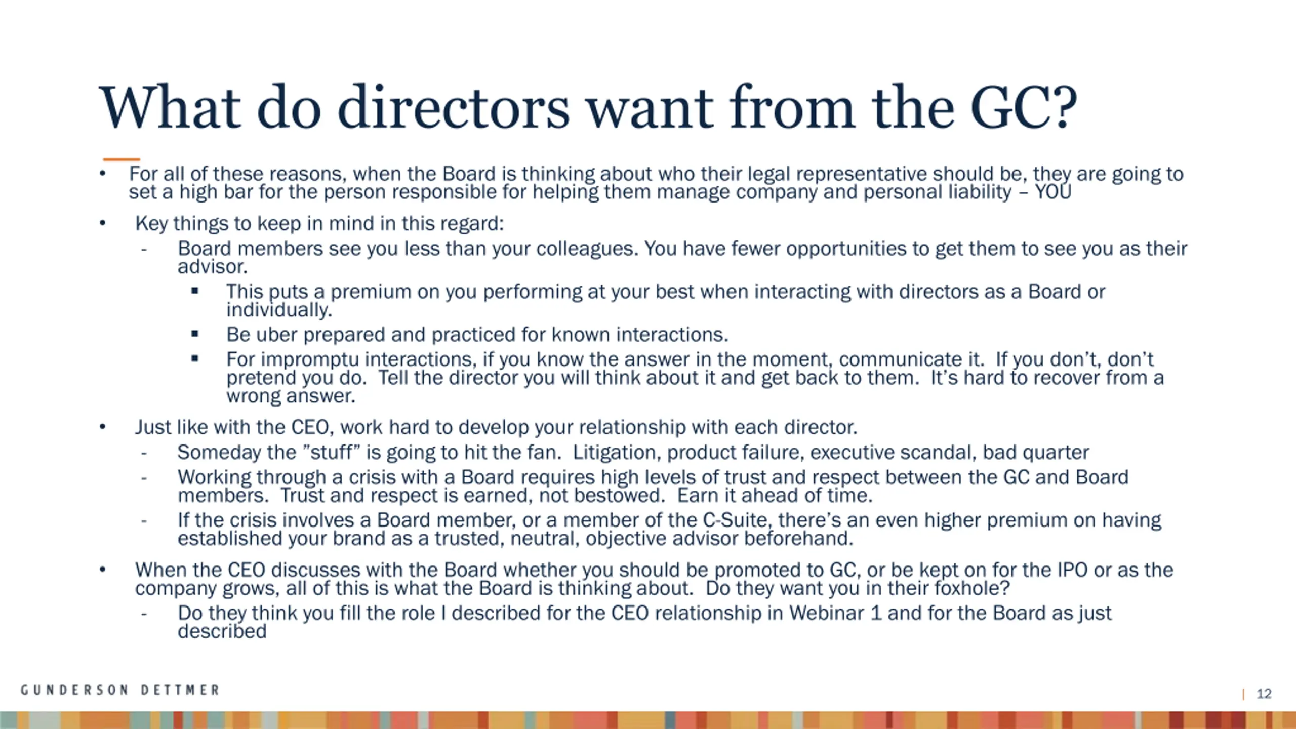 What do directors want from the GC? For all of these reasons, when the Board is thinking about who their legal representative should be, they are going to set a high bar for the person responsible for helping them manage company and personal liability YOU Key things to keep in mind in this regard: - Board members see you less than your colleagues. You have fewer opportunities to get them to see you as their advisor. This puts a premium on you performing at your best when interacting with directors as a Board or individually. Be uber prepared and practiced for known interactions. For impromptu interactions, if you know the answer in the moment, communicate it. If you don t, don t pretend you do. Tell the director you will think about it and get back to them. It s hard to recover from a wrong answer. Just like with the CEO, work hard to develop your relationship with each director. - Someday the stuff is going to hit the fan. Litigation, product failure, executive scandal, bad quarter - Working through a crisis with a Board requires high levels of trust and respect between the GC and Board members. Trust and respect is earned, not bestowed. Earn it ahead of time. - If the crisis involves a Board member, or a member of the C-Suite, there s an even higher premium on having established your brand as a trusted, neutral, objective advisor beforehand. When the CEO discusses with the Board whether you should be promoted to GC, or be kept on for the IPO or as the company grows, all of this is what the Board is thinking about. Do they want you in their foxhole? - Do they think you fill the role I described for the CEO relationship in Webinar 1 and for the Board as just described 12