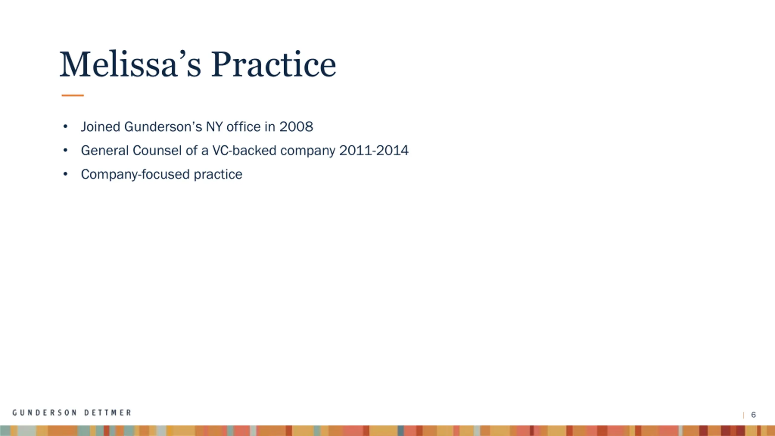 Melissas Practice Joined Gunderson s NY office in 2008 General Counsel of a VC-backed company 2011-2014 Company-focused practice 6