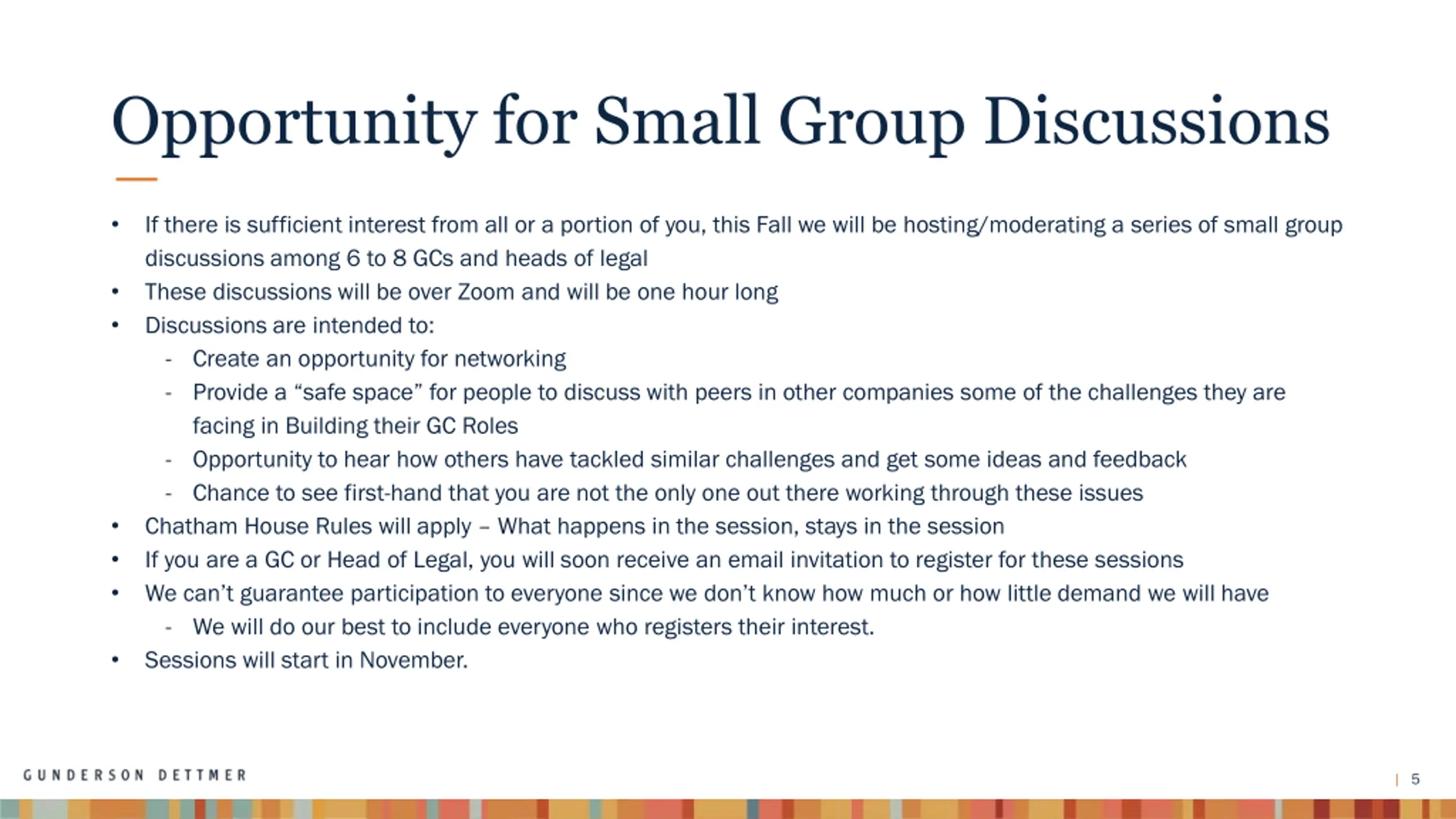 Opportunity for Small Group Discussions If there is sufficient interest from all or a portion of you, this Fall we will be hosting/moderating a series of small group discussions among 6 to 8 GCs and heads of legal These discussions will be over Zoom and will be one hour long Discussions are intended to: - Create an opportunity for networking - Provide a safe space for people to discuss with peers in other companies some of the challenges they are facing in Building their GC Roles - Opportunity to hear how others have tackled similar challenges and get some ideas and feedback - Chance to see first-hand that you are not the only one out there working through these issues Chatham House Rules will apply What happens in the session, stays in the session If you are a GC or Head of Legal, you will soon receive an email invitation to register for these sessions We can t guarantee participation to everyone since we don t know how much or how little demand we will have - We will do our best to include everyone who registers their interest. Sessions will start in November. 5