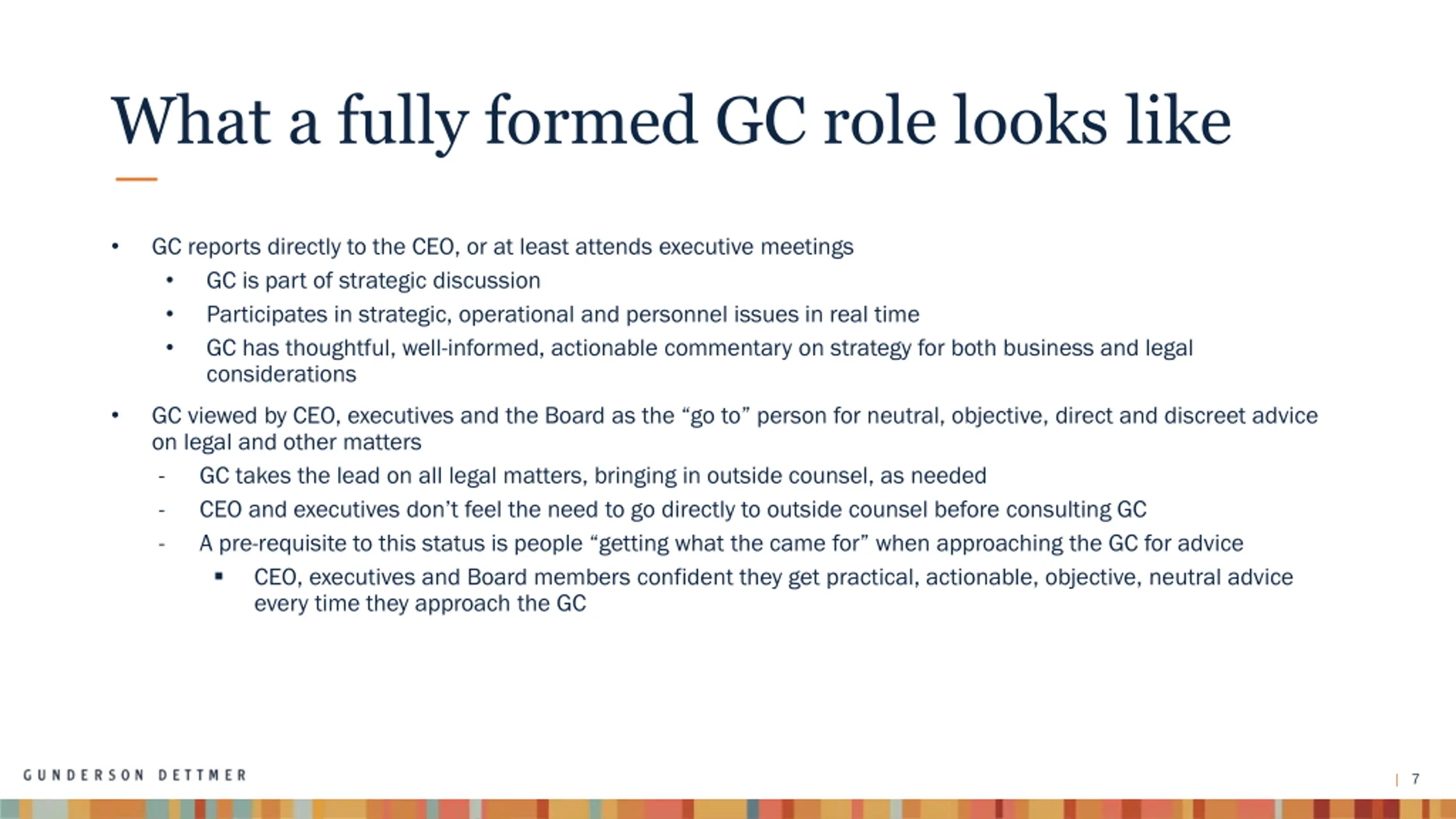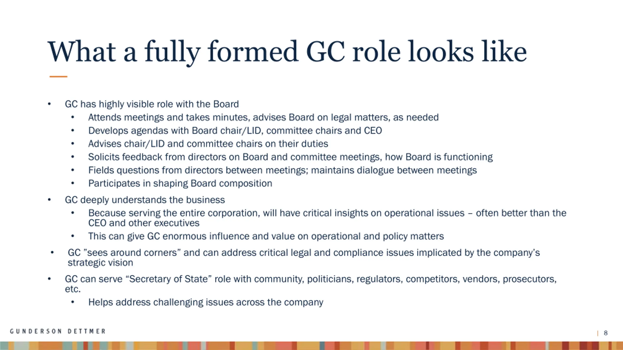 What a fully formed GC role looks like GC reports directly to the CEO, or at least attends executive meetings GC is part of strategic discussion Participates in strategic, operational and personnel issues in real time GC has thoughtful, well-informed, actionable commentary on strategy for both business and legal considerations GC viewed by CEO, executives and the Board as the go to person for neutral, objective, direct and discreet advice on legal and other matters - GC takes the lead on all legal matters, bringing in outside counsel, as needed - CEO and executives don t feel the need to go directly to outside counsel before consulting GC - A pre-requisite to this status is people getting what the came for when approaching the GC for advice CEO, executives and Board members confident they get practical, actionable, objective, neutral advice every time they approach the GC 7
