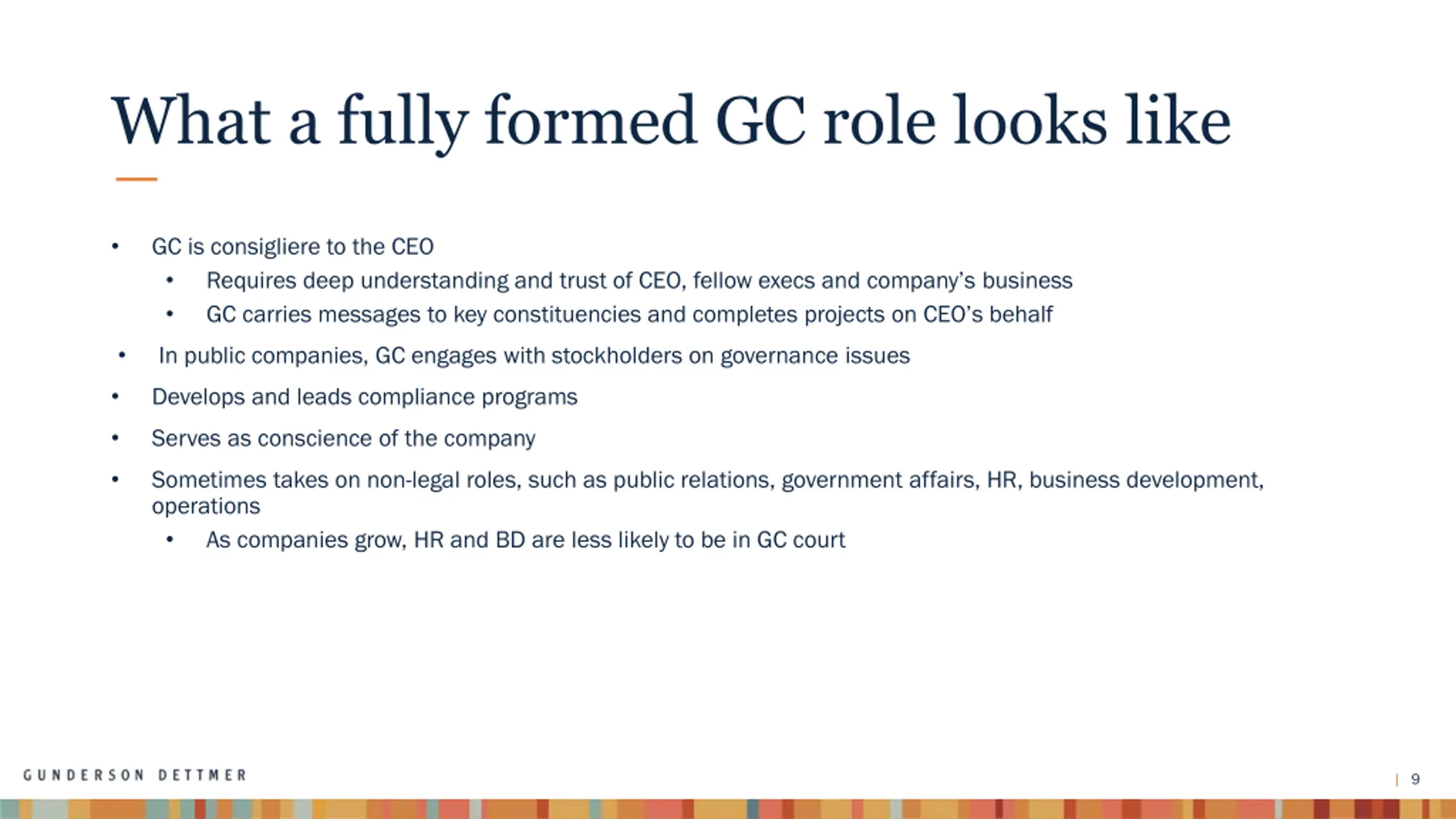 What a fully formed GC role looks like GC has highly visible role with the Board Attends meetings and takes minutes, advises Board on legal matters, as needed Develops agendas with Board chair/LID, committee chairs and CEO Advises chair/LID and committee chairs on their duties Solicits feedback from directors on Board and committee meetings, how Board is functioning Fields questions from directors between meetings; maintains dialogue between meetings Participates in shaping Board composition GC deeply understands the business Because serving the entire corporation, will have critical insights on operational issues often better than the CEO and other executives This can give GC enormous influence and value on operational and policy matters GC sees around corners and can address critical legal and compliance issues implicated by the company s strategic vision GC can serve Secretary of State role with community, politicians, regulators, competitors, vendors, prosecutors, etc. Helps address challenging issues across the company 8