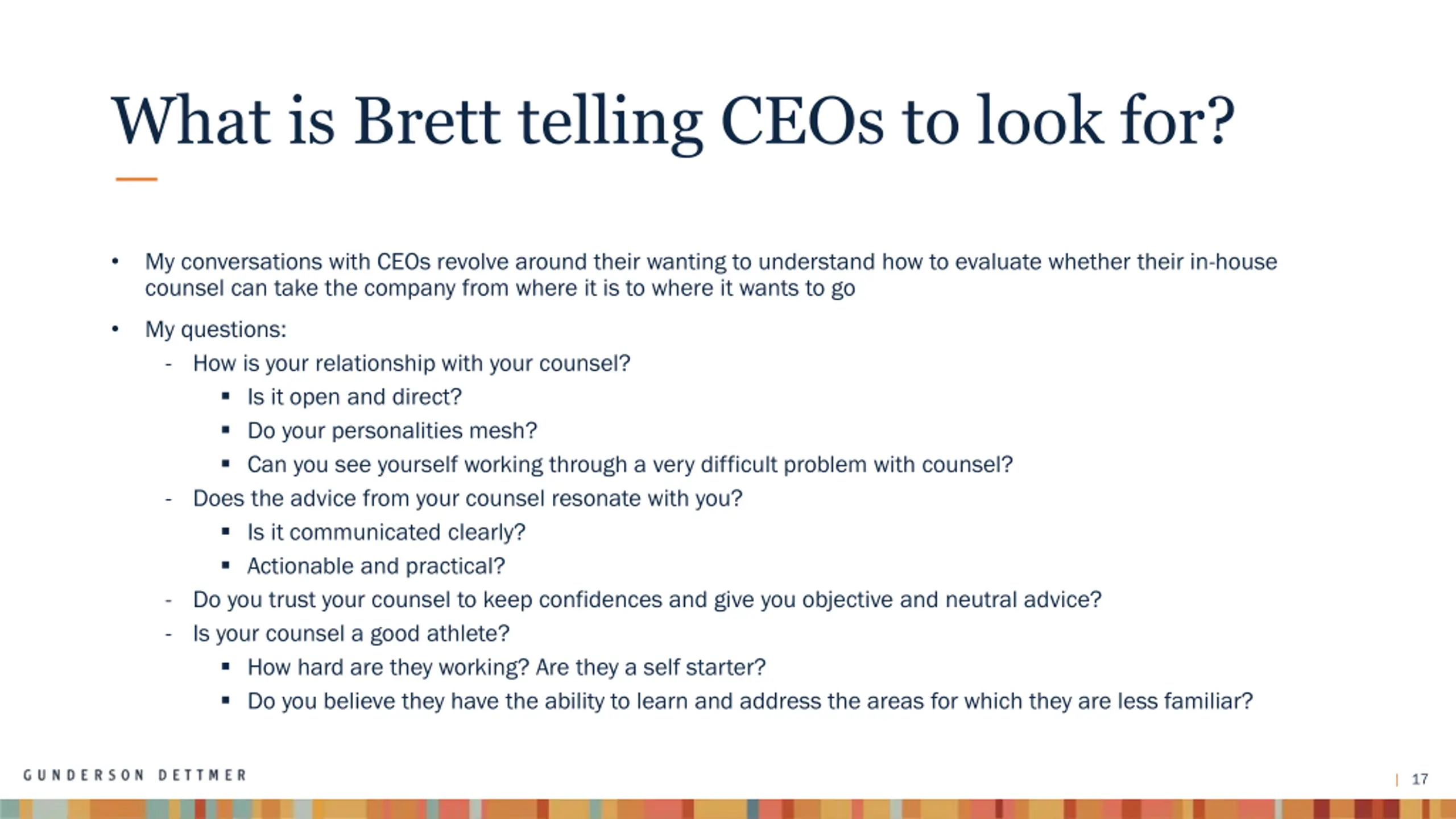 What is Brett telling CEOs to look for? My conversations with CEOs revolve around their wanting to understand how to evaluate whether their in-house counsel can take the company from where it is to where it wants to go My questions: - How is your relationship with your counsel? Is it open and direct? Do your personalities mesh? Can you see yourself working through a very difficult problem with counsel? - Does the advice from your counsel resonate with you? Is it communicated clearly? Actionable and practical? - Do you trust your counsel to keep confidences and give you objective and neutral advice? - Is your counsel a good athlete? How hard are they working? Are they a self starter? Do you believe they have the ability to learn and address the areas for which they are less familiar? 17