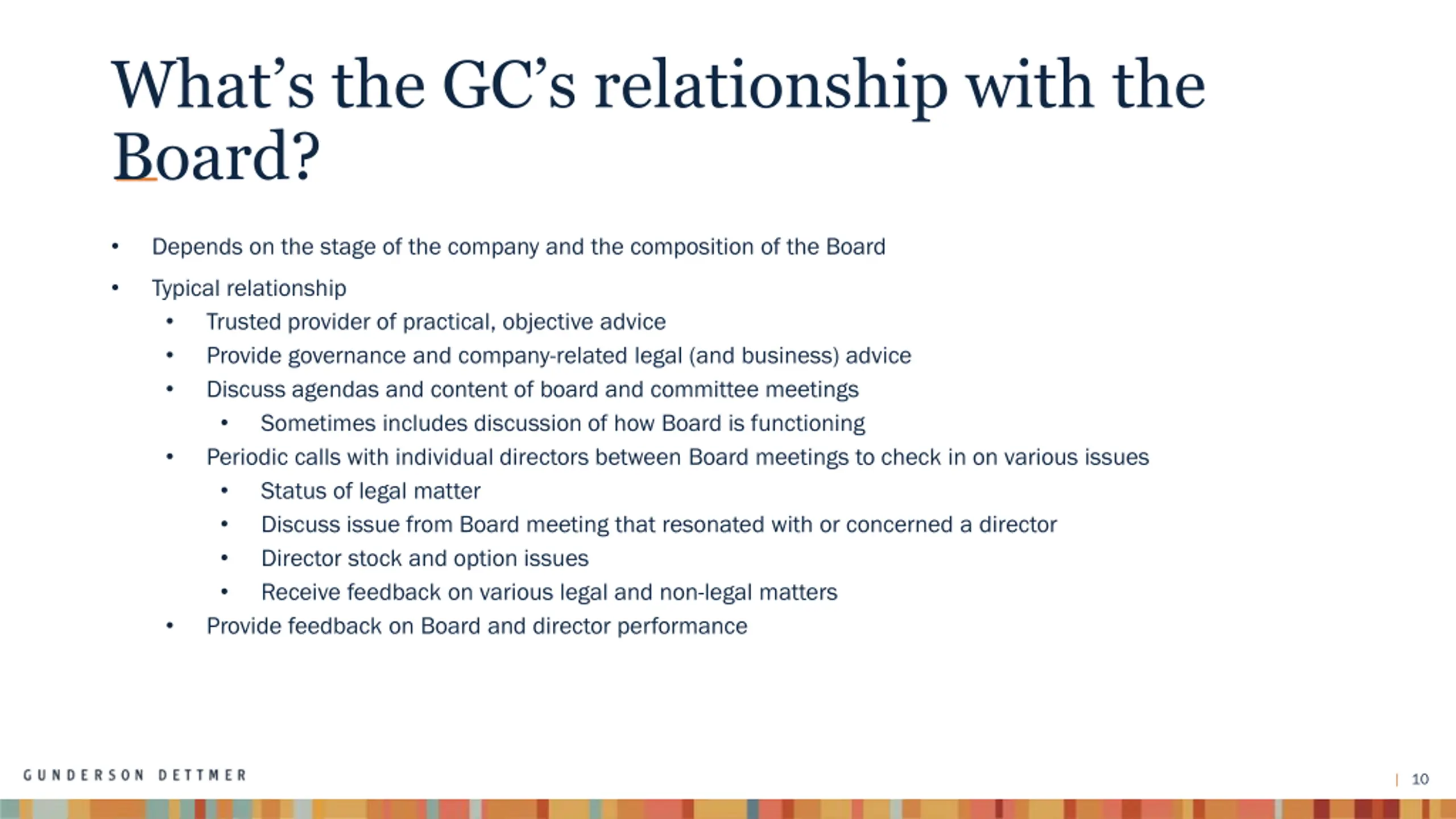 What a fully formed GC role looks like GC is consigliere to the CEO Requires deep understanding and trust of CEO, fellow execs and company s business GC carries messages to key constituencies and completes projects on CEO s behalf In public companies, GC engages with stockholders on governance issues Develops and leads compliance programs Serves as conscience of the company Sometimes takes on non-legal roles, such as public relations, government affairs, HR, business development, operations As companies grow, HR and BD are less likely to be in GC court 9