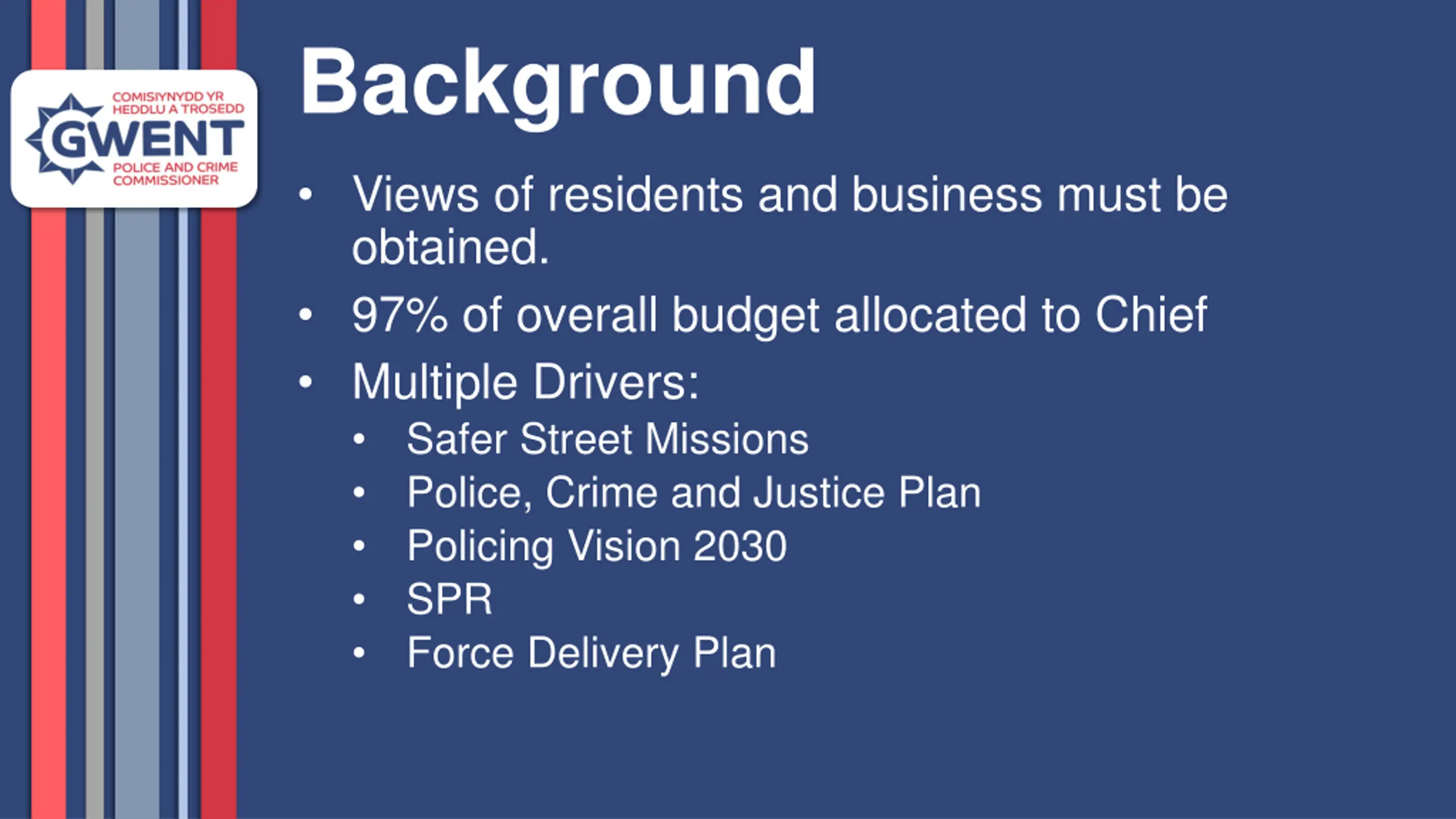 Background Views of residents and business must be obtained. 97% of overall budget allocated to Chief Multiple Drivers: Safer Street Missions Police, Crime and Justice Plan Policing Vision 2030 SPR Force Delivery Plan