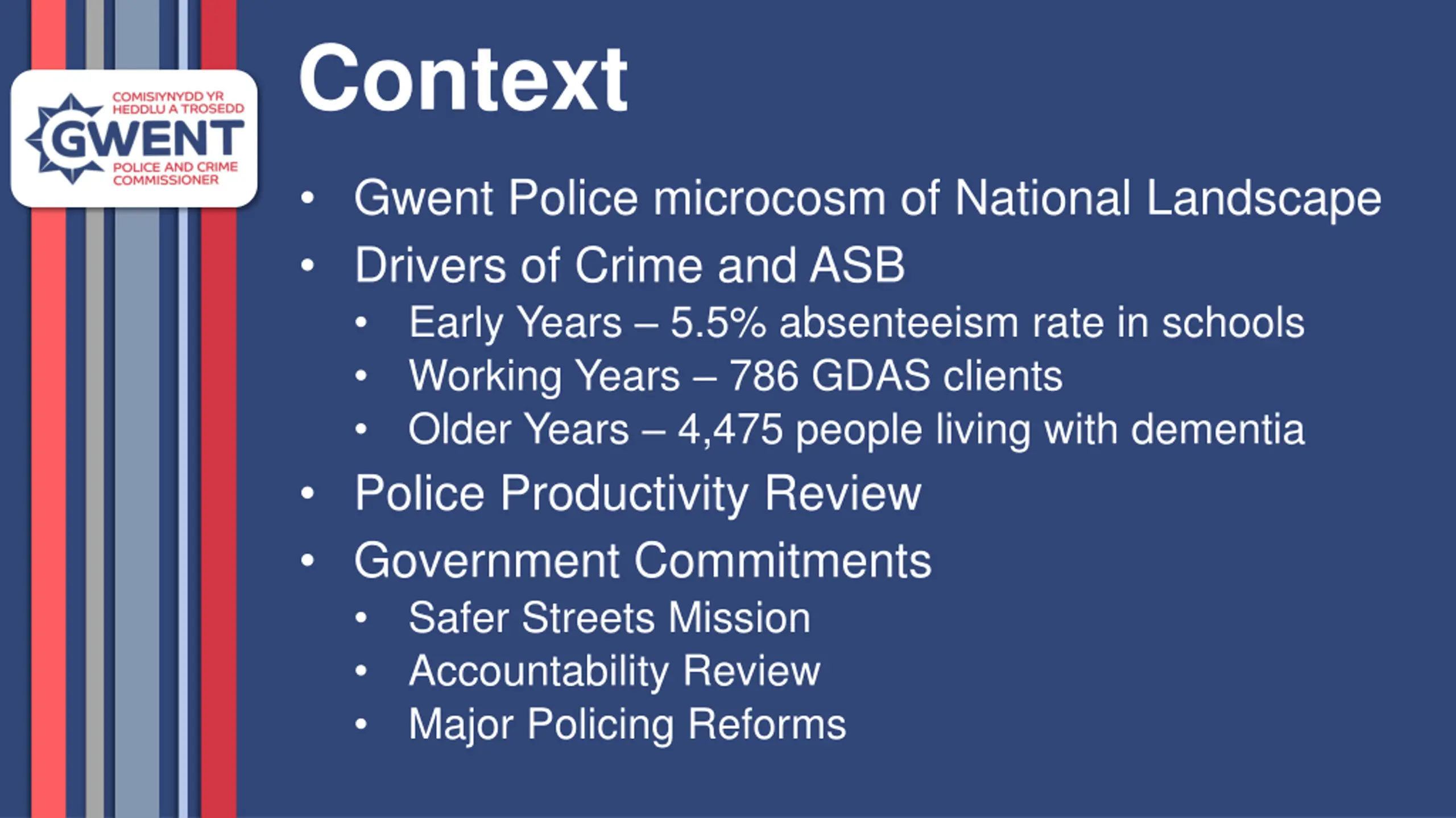 Context Gwent Police microcosm of National Landscape Drivers of Crime and ASB Early Years 5.5% absenteeism rate in schools Working Years 786 GDAS clients Older Years 4,475 people living with dementia Police Productivity Review Government Commitments Safer Streets Mission Accountability Review Major Policing Reforms