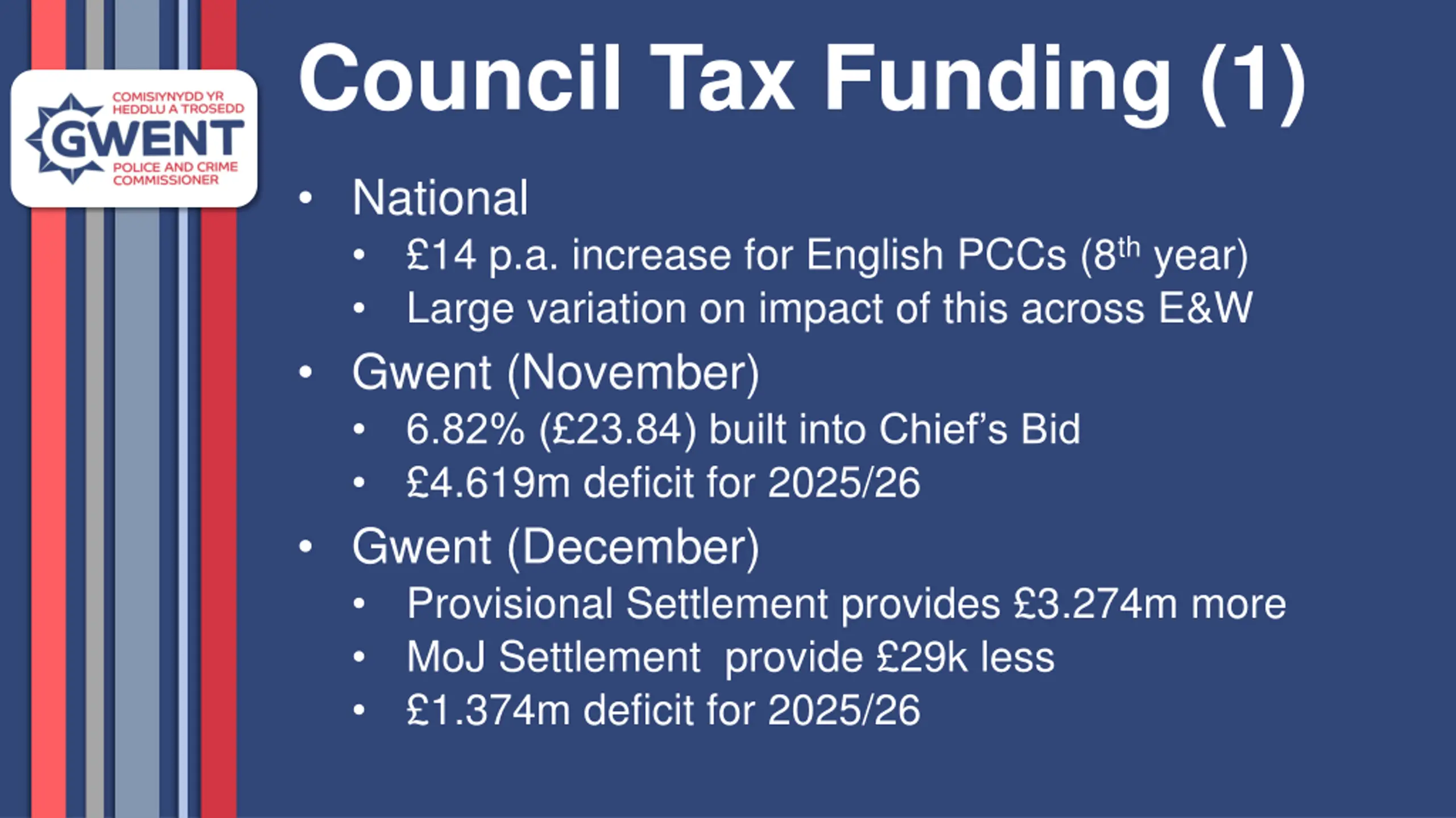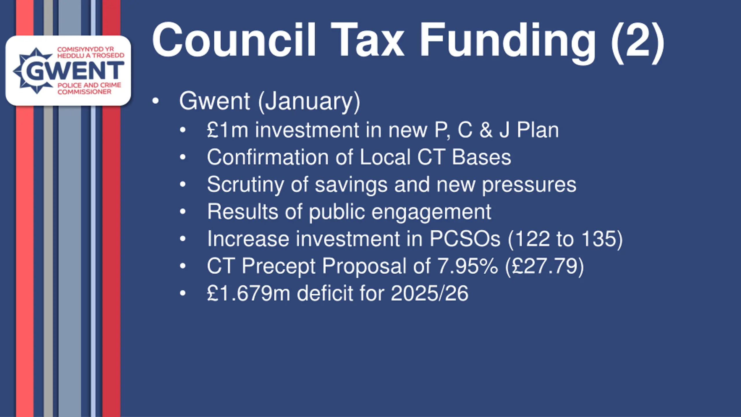Council Tax Funding (2) Gwent (January) 1m investment in new P, C & J Plan Confirmation of Local CT Bases Scrutiny of savings and new pressures Results of public engagement Increase investment in PCSOs (122 to 135) CT Precept Proposal of 7.95% ( 27.79) 1.679m deficit for 2025/26