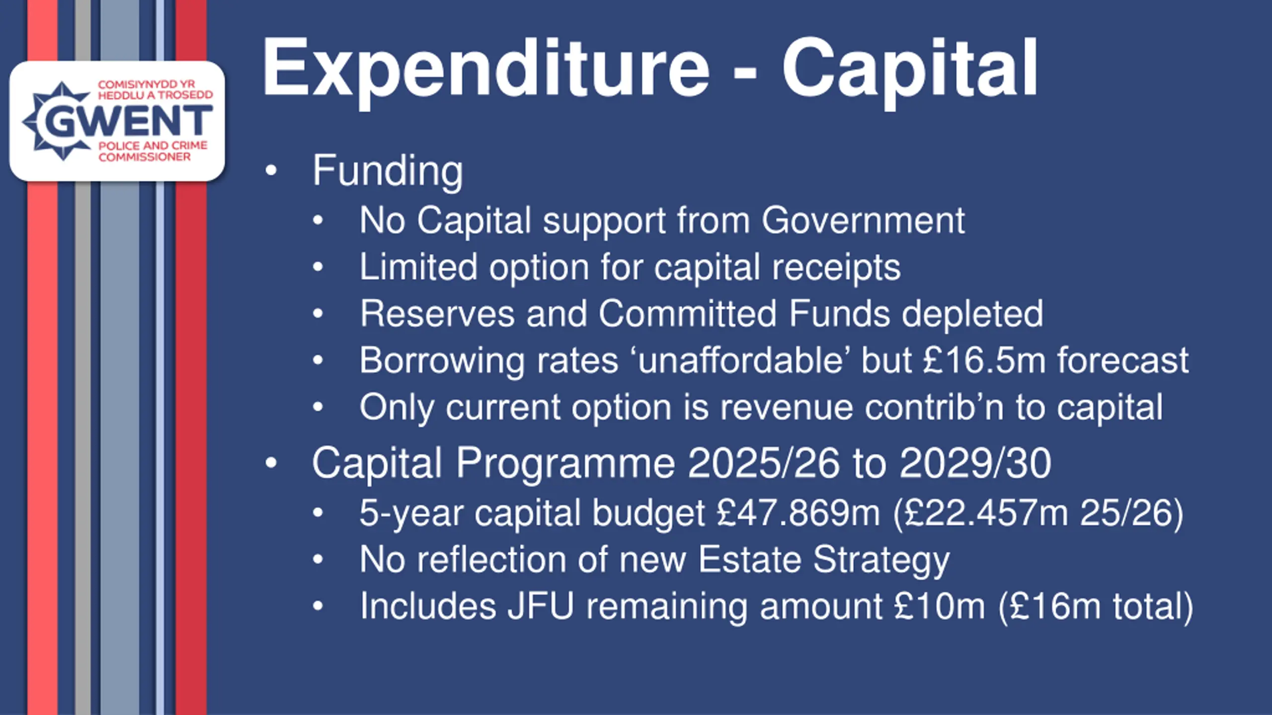 Expenditure - Capital Funding No Capital support from Government Limited option for capital receipts Reserves and Committed Funds depleted Borrowing rates unaffordable but 16.5m forecast Only current option is revenue contrib n to capital Capital Programme 2025/26 to 2029/30 5-year capital budget 47.869m ( 22.457m 25/26) No reflection of new Estate Strategy Includes JFU remaining amount 10m ( 16m total)