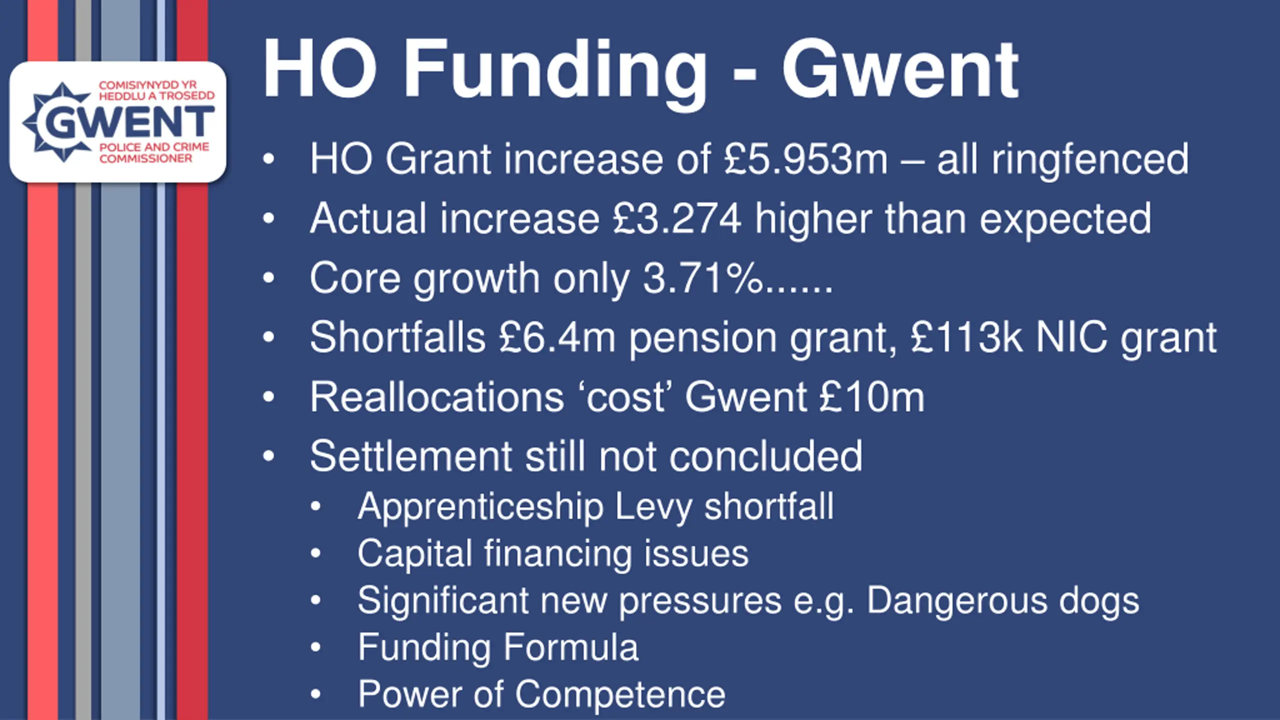 HO Funding - Gwent HO Grant increase of 5.953m all ringfenced Actual increase 3.274 higher than expected Core growth only 3.71%...... Shortfalls 6.4m pension grant, 113k NIC grant Reallocations cost Gwent 10m Settlement still not concluded Apprenticeship Levy shortfall Capital financing issues Significant new pressures e.g. Dangerous dogs Funding Formula Power of Competence