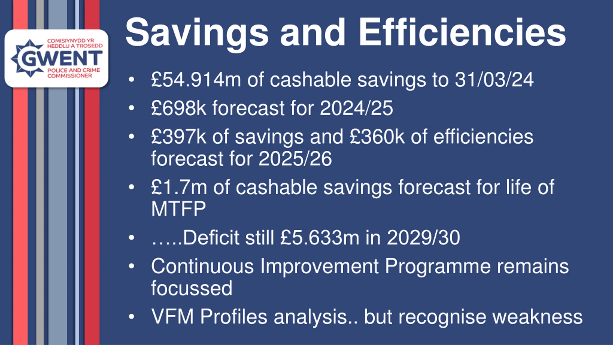 Savings and Efficiencies 54.914m of cashable savings to 31/03/24 698k forecast for 2024/25 397k of savings and 360k of efficiencies forecast for 2025/26 1.7m of cashable savings forecast for life of MTFP ..Deficit still 5.633m in 2029/30 Continuous Improvement Programme remains focussed VFM Profiles analysis.. but recognise weakness
