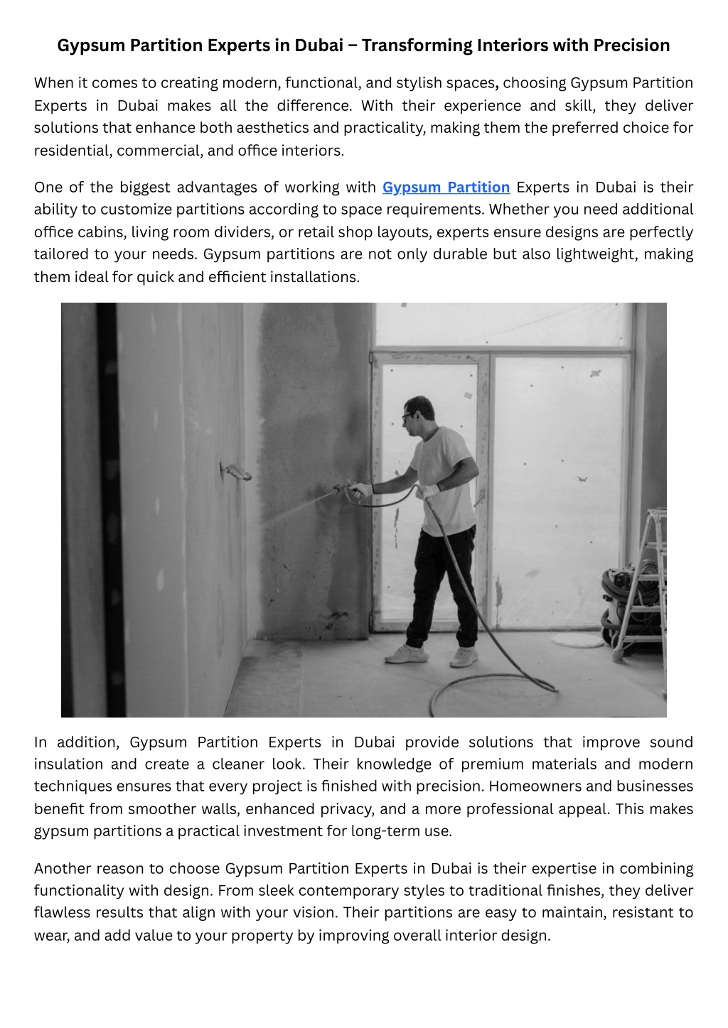 Gypsum Partition Experts in Dubai Transforming Interiors with Precision When it comes to creating modern, functional, and stylish spaces, choosingGypsum Partition Experts in Dubai makes all the di?erence. With their experience and skill, they deliver solutions that enhance both aesthetics and practicality, making them the preferred choice for residential, commercial, and office interiors. One of the biggest advantages of working with Gypsum PartitionExperts in Dubai is their ability to customize partitions according to space requirements. Whether you need additional office cabins, living room dividers, or retail shop layouts, experts ensure designs are perfectly tailored to your needs. Gypsum partitions are not only durable but also lightweight, making them ideal for quick and efficient installations. In addition, Gypsum Partition Experts in Dubai provide solutions that improve sound insulation and create a cleaner look. Their knowledge of premium materials and modern techniques ensures that every project is finished with precision. Homeowners and businesses benefit from smoother walls, enhanced privacy, and a more professional appeal. This makes gypsum partitions a practical investment for long-term use. Another reason to choose Gypsum Partition Experts in Dubai is their expertise in combining functionality with design. From sleek contemporary styles to traditional finishes, they deliver flawless results that align with your vision. Their partitions are easy to maintain, resistant to wear, and add value to your property by improving overall interior design.