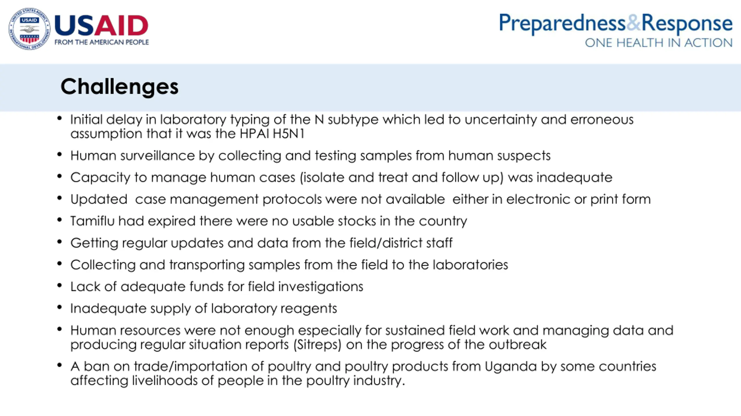 Challenges Initial delay in laboratory typing of the N subtype which led to uncertainty and erroneous assumption that it was the HPAI H5N1 Human surveillance by collecting and testing samples from human suspects Capacity to manage human cases (isolate and treat and follow up) was inadequate Updated case management protocols were not available either in electronic or print form Tamiflu had expired there were no usable stocks in the country Getting regular updates and data from the field/district staff Collecting and transporting samples from the field to the laboratories Lack of adequate funds for field investigations Inadequate supply of laboratory reagents Human resources were not enough especially for sustained field work and managing data and producing regular situation reports (Sitreps) on the progress of the outbreak A ban on trade/importation of poultry and poultry products from Uganda by some countries affecting livelihoods of people in the poultry industry.