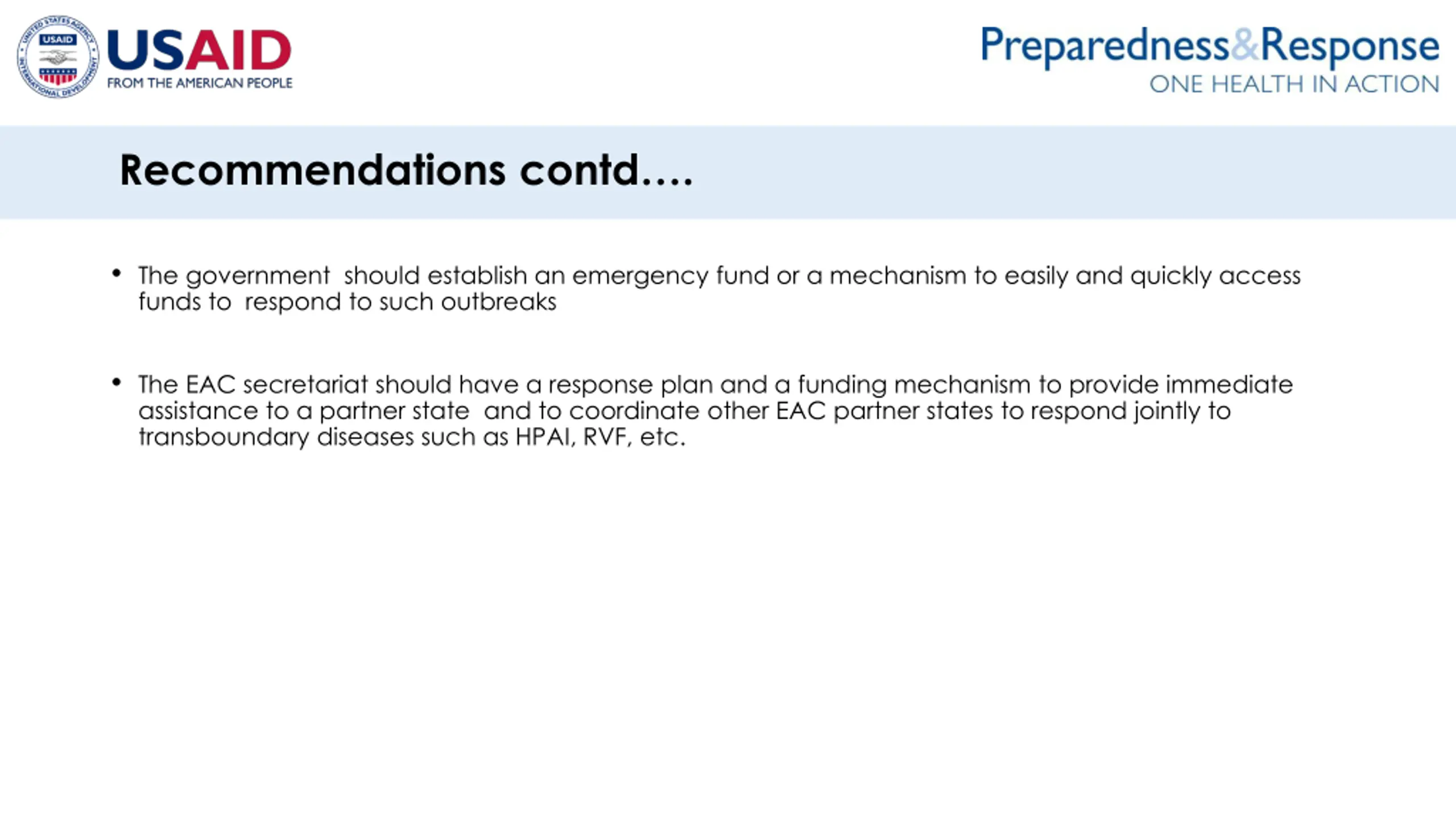 Recommendations contd. The government should establish an emergency fund or a mechanism to easily and quickly access funds to respond to such outbreaks The EAC secretariat should have a response plan and a funding mechanism to provide immediate assistance to a partner state and to coordinate other EAC partner states to respond jointly to transboundary diseases such as HPAI, RVF, etc.