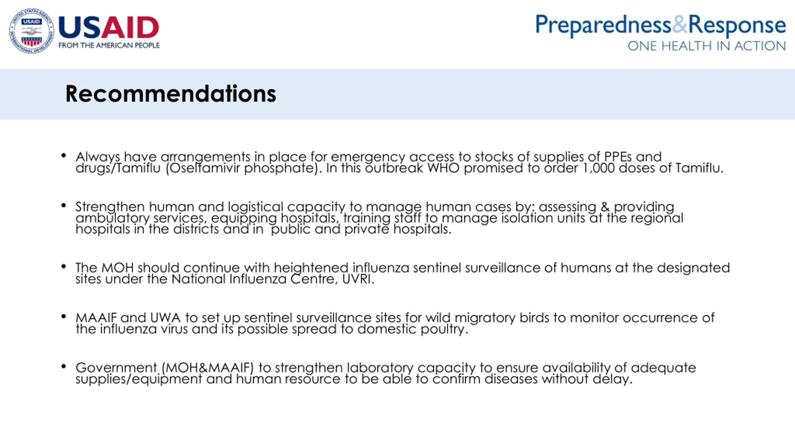 Recommendations Always have arrangements in place for emergency access to stocks of supplies of PPEs and drugs/Tamiflu (Oseltamivir phosphate). In this outbreak WHO promised to order 1,000 doses of Tamiflu. Strengthen human and logistical capacity to manage human cases by: assessing & providing ambulatory services, equipping hospitals, training staff to manage isolation units at the regional hospitals in the districts and in public and private hospitals. The MOH should continue with heightened influenza sentinel surveillance of humans at the designated sites under the National Influenza Centre, UVRI. MAAIF and UWA to set up sentinel surveillance sites for wild migratory birds to monitor occurrence of the influenza virus and its possible spread to domestic poultry. Government (MOH&MAAIF) to strengthen laboratory capacity to ensure availability of adequate supplies/equipment and human resource to be able to confirm diseases without delay.