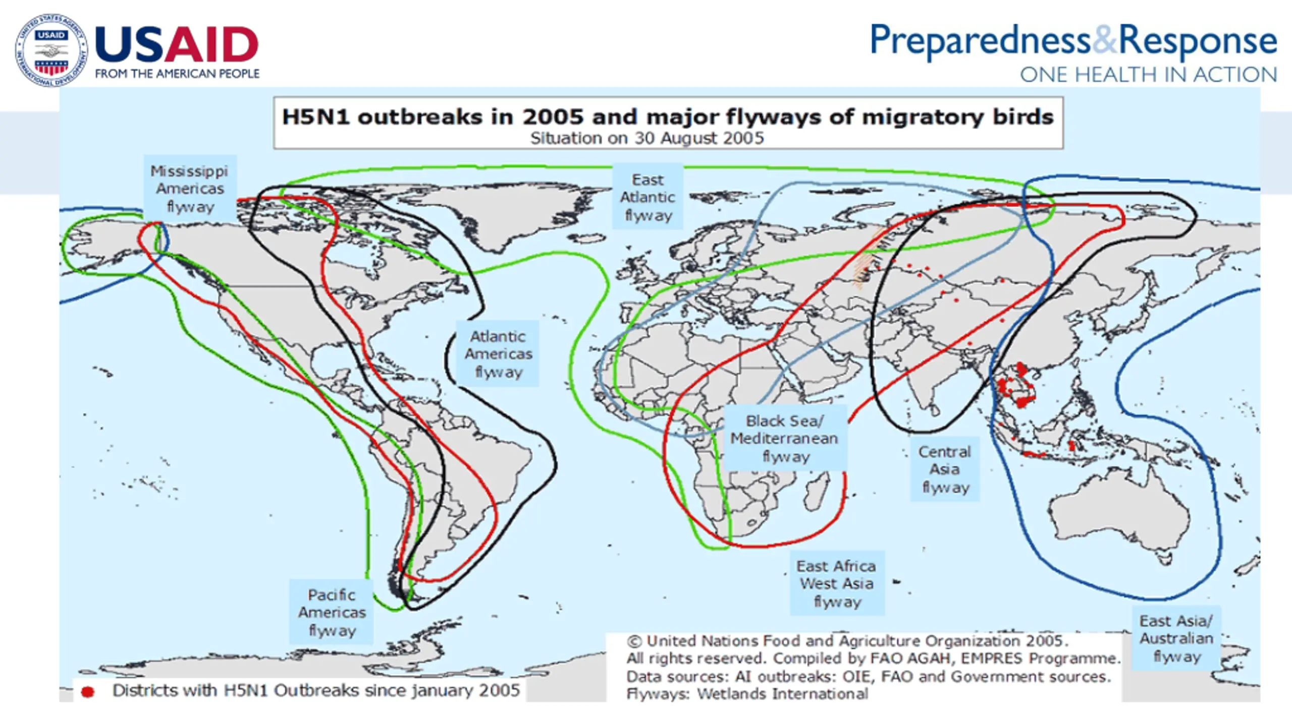 Introduction & country context Uganda lies along the pathway of wild migratory birds flying from the northern to southern hemisphere during winter in Europe HPAI outbreaks have been reported in many countries in Europe the 2016/2017 winter season Although no HPAI had ever been confirmed in Uganda, a pandemic influenza H1N1 outbreak was reported in 2009-2010 with 261human cases but no deaths. The H1N1 outbreak enable the country to build infrastructure and human capacity to prepare and respond to HPAI Through the AHIP Project 2010-2014: HPAI Preparedness & Response Plan and a Communication Strategy were developed ; two BSL3 laboratories were built at Uganda Virus Research Institute (UVRI ) of Ministry of Health (MOH) & National Animal Diseases diagnostic and Epidemiology Centre (NADDEC ) of Ministry of Agriculture, Animal Industry & Fisheries (MAAIF); One Isolation unit was constructed & equipped at Entebbe Hospital; National and district staff were trained and skilled on key aspects of HPAI prevention and control; Guidelines and treatment protocols were developed, printed and disseminated; Communities were sensitized.