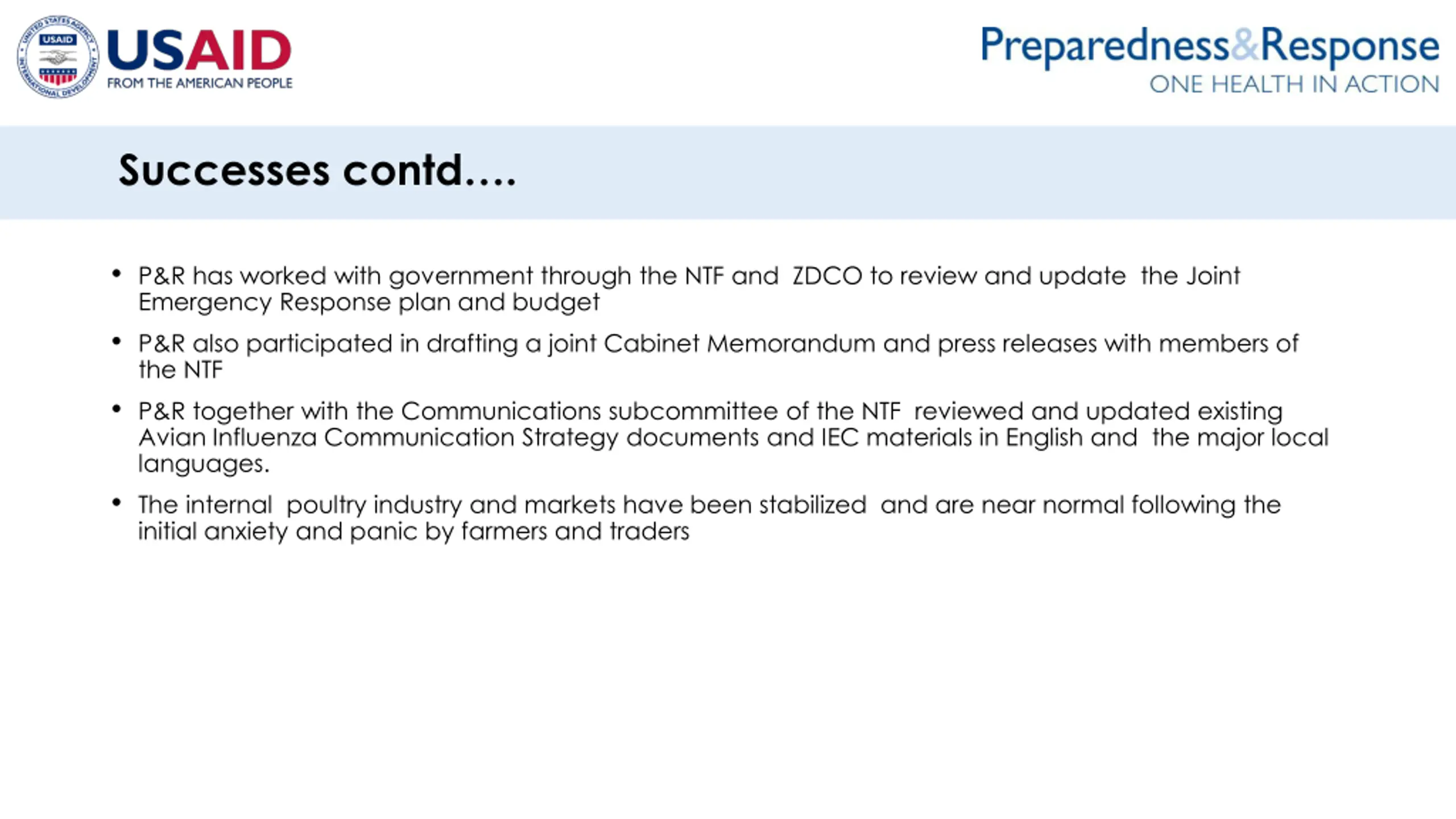Successes contd. P&R has worked with government through the NTF and ZDCO to review and update the Joint Emergency Response plan and budget P&R also participated in drafting a joint Cabinet Memorandum and press releases with members of the NTF P&R together with the Communications subcommittee of the NTF reviewed and updated existing Avian Influenza Communication Strategy documents and IEC materials in English and the major local languages. The internal poultry industry and markets have been stabilized and are near normal following the initial anxiety and panic by farmers and traders