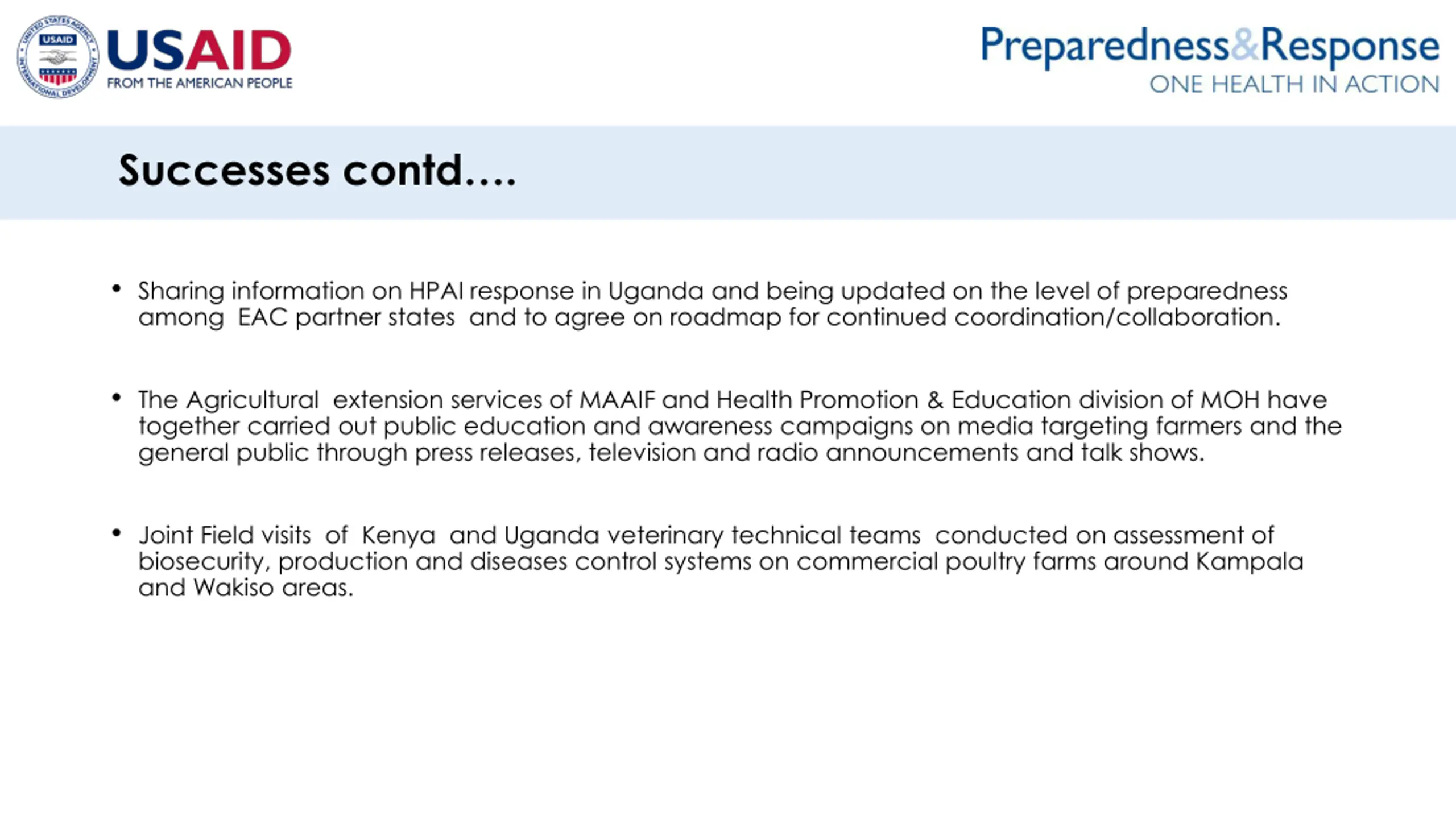 Successes contd. Sharing information on HPAI response in Uganda and being updated on the level of preparedness among EAC partner states and to agree on roadmap for continued coordination/collaboration. The Agricultural extension services of MAAIF and Health Promotion & Education division of MOH have together carried out public education and awareness campaigns on media targeting farmers and the general public through press releases, television and radio announcements and talk shows. Joint Field visits of Kenya and Uganda veterinary technical teams conducted on assessment of biosecurity, production and diseases control systems on commercial poultry farms around Kampala and Wakiso areas.