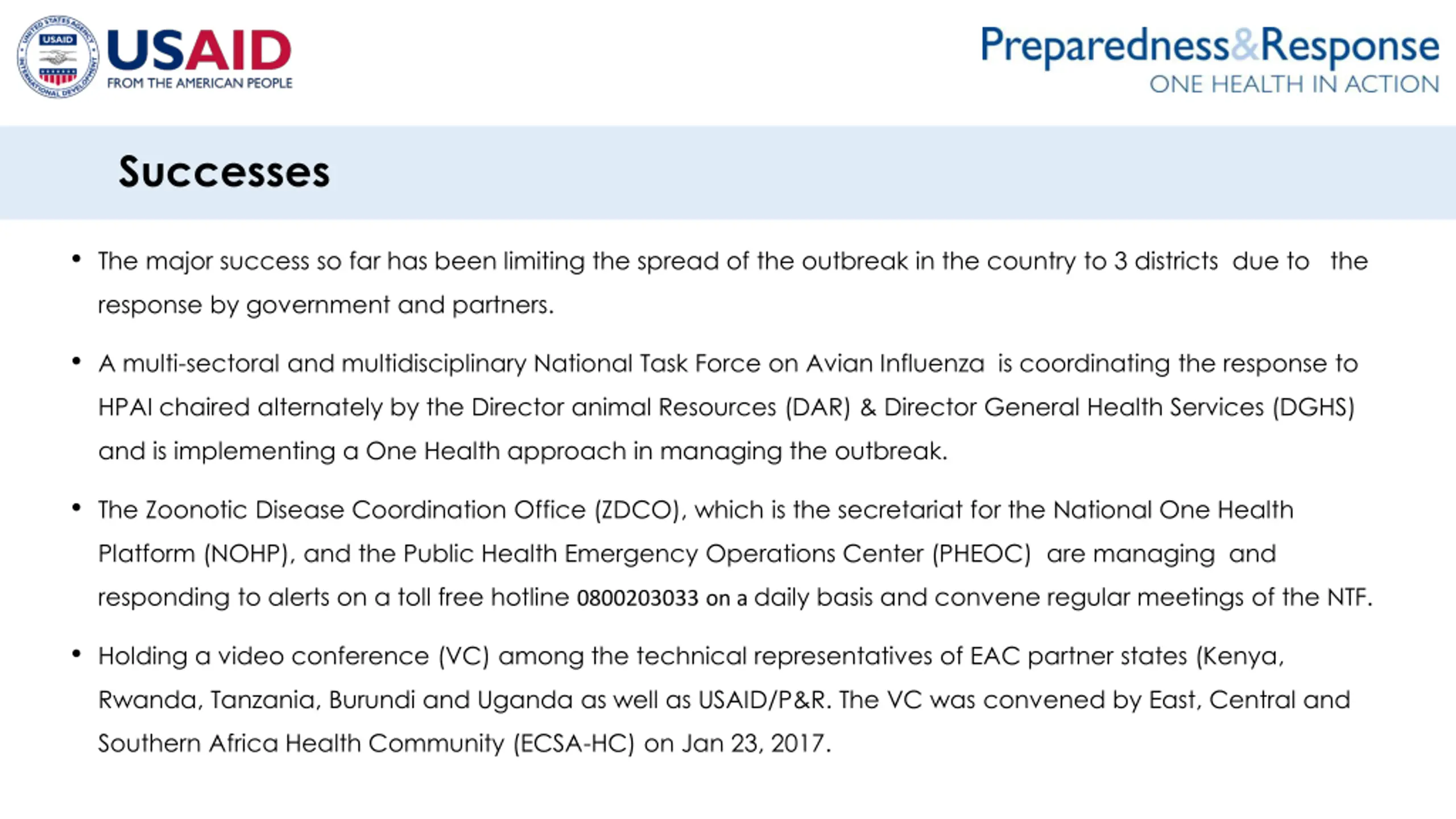 Successes The major success so far has been limiting the spread of the outbreak in the country to 3 districts due to the response by government and partners. A multi-sectoral and multidisciplinary National Task Force on Avian Influenza is coordinating the response to HPAI chaired alternately by the Director animal Resources (DAR) & Director General Health Services (DGHS) and is implementing a One Health approach in managing the outbreak. The Zoonotic Disease Coordination Office (ZDCO), which is the secretariat for the National One Health Platform (NOHP), and the Public Health Emergency Operations Center (PHEOC) are managing and responding to alerts on a toll free hotline 0800203033 on a daily basis and convene regular meetings of the NTF. Holding a video conference (VC) among the technical representatives of EAC partner states (Kenya, Rwanda, Tanzania, Burundi and Uganda as well as USAID/P&R. The VC was convened by East, Central and Southern Africa Health Community (ECSA-HC) on Jan 23, 2017.