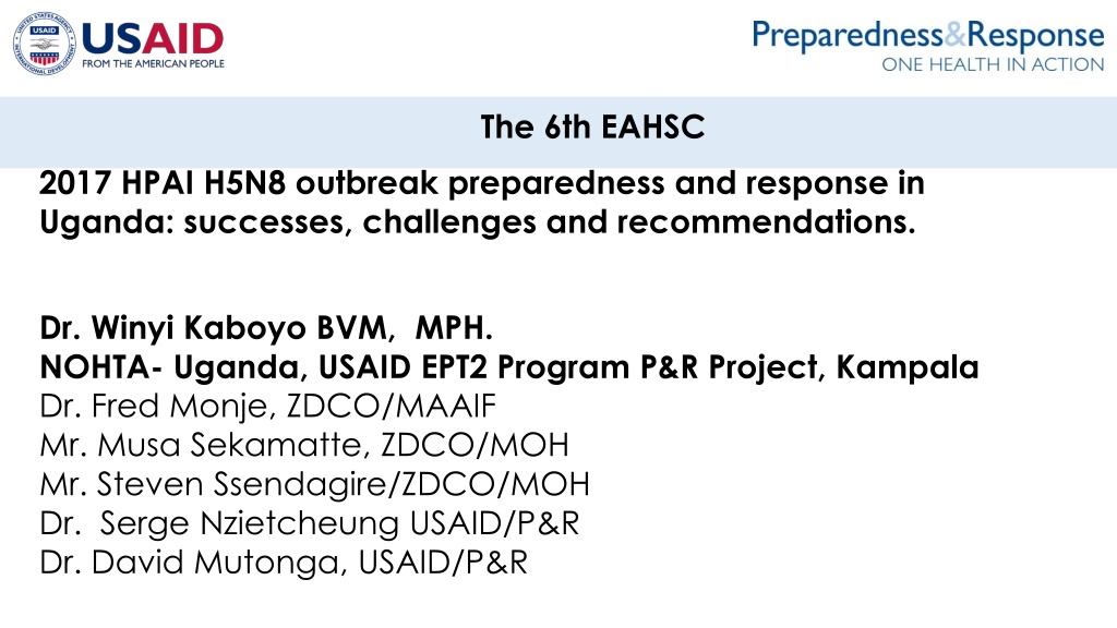 The 6th EAHSC 2017 HPAI H5N8 outbreak preparedness and response in Uganda: successes, challenges and recommendations. Dr. Winyi Kaboyo BVM, MPH. NOHTA- Uganda, USAID EPT2 Program P&R Project, Kampala Dr. Fred Monje, ZDCO/MAAIF Mr. Musa Sekamatte, ZDCO/MOH Mr. Steven Ssendagire/ZDCO/MOH Dr. Serge Nzietcheung USAID/P&R Dr. David Mutonga, USAID/P&R