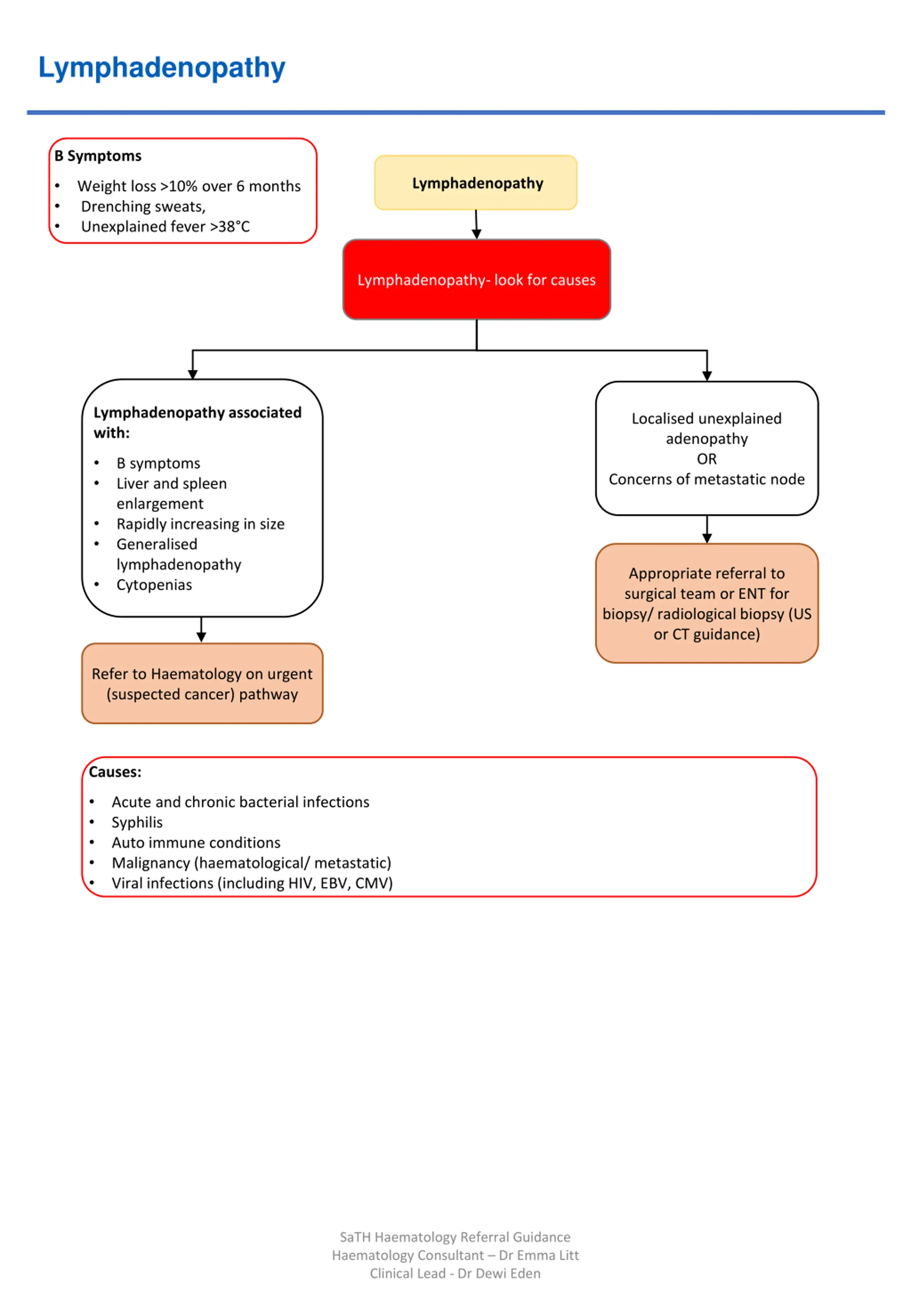 Lymphadenopathy B Symptoms Lymphadenopathy Weight loss >10% over 6 months Drenching sweats, Unexplained fever >38 C Lymphadenopathy- look for causes Lymphadenopathy associated with: Localised unexplained adenopathy OR Concerns of metastatic node B symptoms Liver and spleen enlargement Rapidly increasing in size Generalised lymphadenopathy Cytopenias Appropriate referral to surgical team or ENT for biopsy/ radiological biopsy (US or CT guidance) Refer to Haematology on urgent (suspected cancer) pathway Causes: Acute and chronic bacterial infections Syphilis Auto immune conditions Malignancy (haematological/ metastatic) Viral infections (including HIV, EBV, CMV) SaTH Haematology Referral Guidance Haematology Consultant Dr Emma Litt Clinical Lead - Dr Dewi Eden