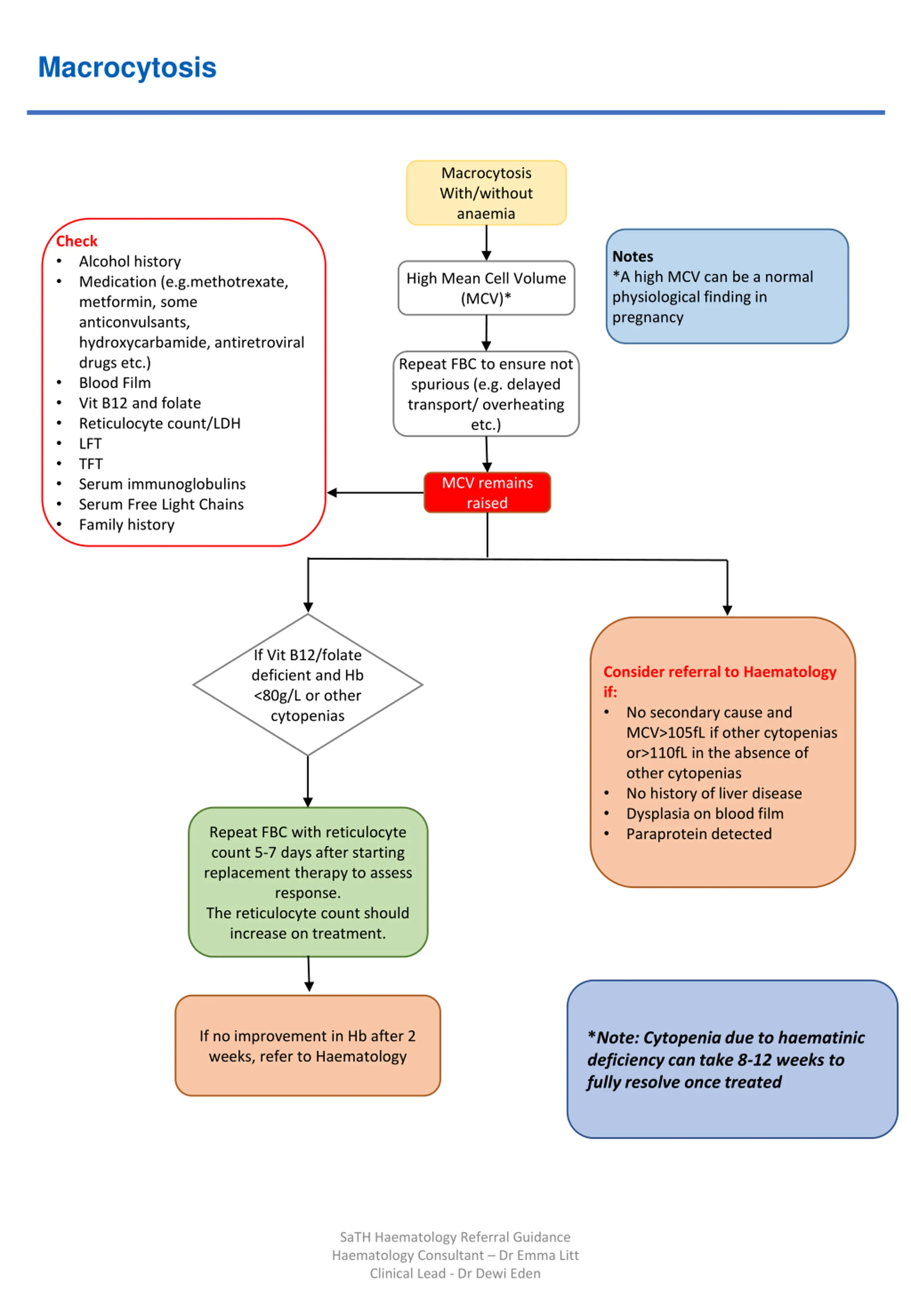 Macrocytosis Macrocytosis With/without anaemia Check Notes *A high MCV can be a normal physiological finding in pregnancy Alcohol history Medication (e.g.methotrexate, metformin, some anticonvulsants, hydroxycarbamide, antiretroviral drugs etc.) Blood Film Vit B12 and folate Reticulocyte count/LDH LFT TFT Serum immunoglobulins Serum Free Light Chains Family history High Mean Cell Volume (MCV)* Repeat FBC to ensure not spurious (e.g. delayed transport/ overheating etc.) MCV remains raised If Vit B12/folate deficient and Hb <80g/L or other cytopenias Consider referral to Haematology if: No secondary cause and MCV>105fL if other cytopenias or>110fL in the absence of other cytopenias No history of liver disease Dysplasia on blood film Paraprotein detected Repeat FBC with reticulocyte count 5-7 days after starting replacement therapy to assess response. The reticulocyte count should increase on treatment. If no improvement in Hb after 2 weeks, refer to Haematology *Note: Cytopenia due to haematinic deficiency can take 8-12 weeks to fully resolve once treated SaTH Haematology Referral Guidance Haematology Consultant Dr Emma Litt Clinical Lead - Dr Dewi Eden