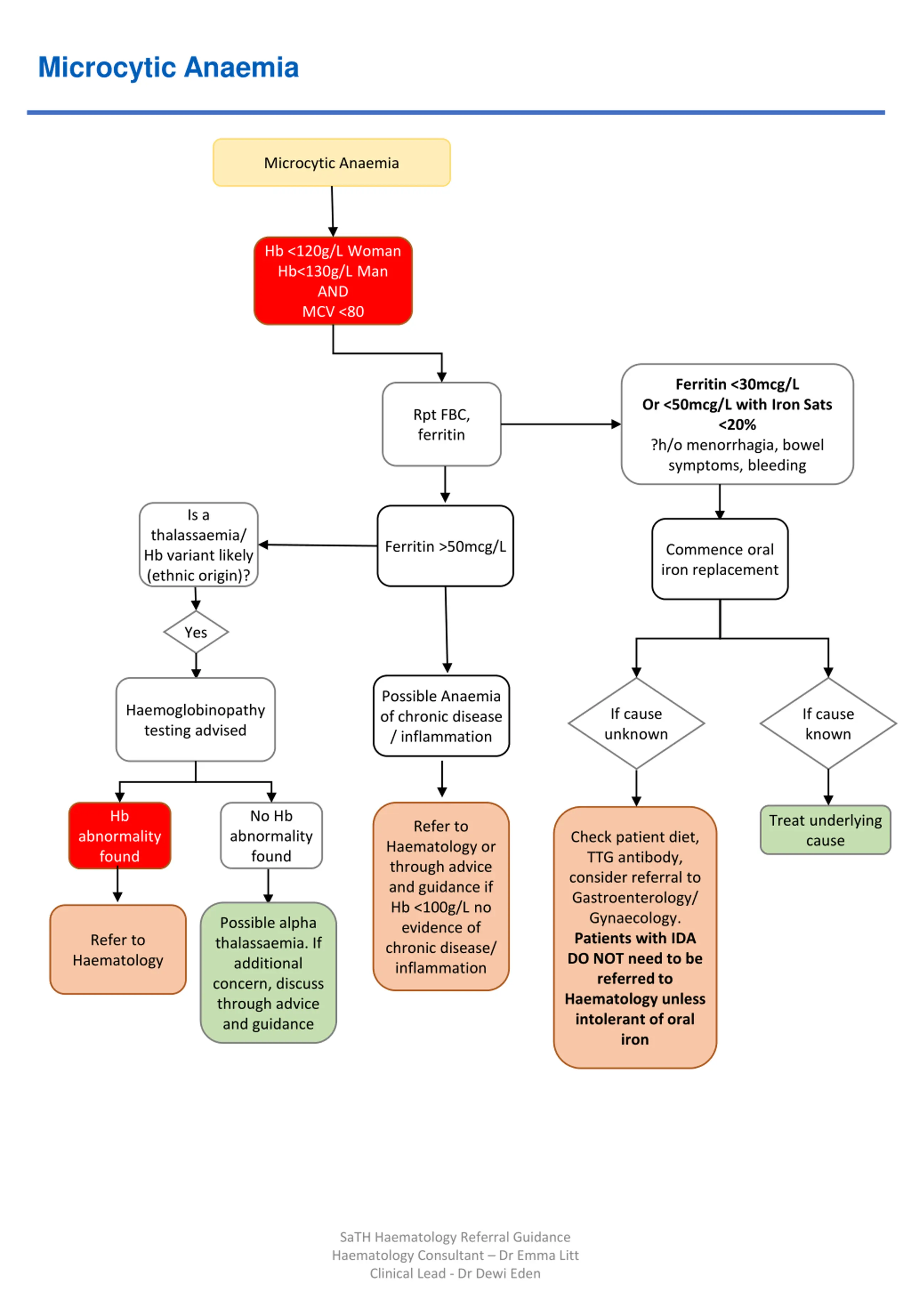 Microcytic Anaemia Microcytic Anaemia Hb <120g/L Woman Hb<130g/L Man AND MCV <80 Ferritin <30mcg/L Or <50mcg/L with Iron Sats <20% ?h/o menorrhagia, bowel symptoms, bleeding Rpt FBC, ferritin Is a thalassaemia/ Hb variant likely (ethnic origin)? Ferritin >50mcg/L Commence oral iron replacement Yes Possible Anaemia of chronic disease / inflammation Haemoglobinopathy testing advised If cause unknown If cause known No Hb abnormality found Hb Treat underlying cause Refer to Haematology or through advice and guidance if Hb <100g/L no evidence of chronic disease/ inflammation abnormality found Check patient diet, TTG antibody, consider referral to Gastroenterology/ Gynaecology. Patients with IDA DO NOT need to be referred to Haematology unless intolerant of oral iron Possible alpha thalassaemia. If additional concern, discuss through advice and guidance Refer to Haematology SaTH Haematology Referral Guidance Haematology Consultant Dr Emma Litt Clinical Lead - Dr Dewi Eden