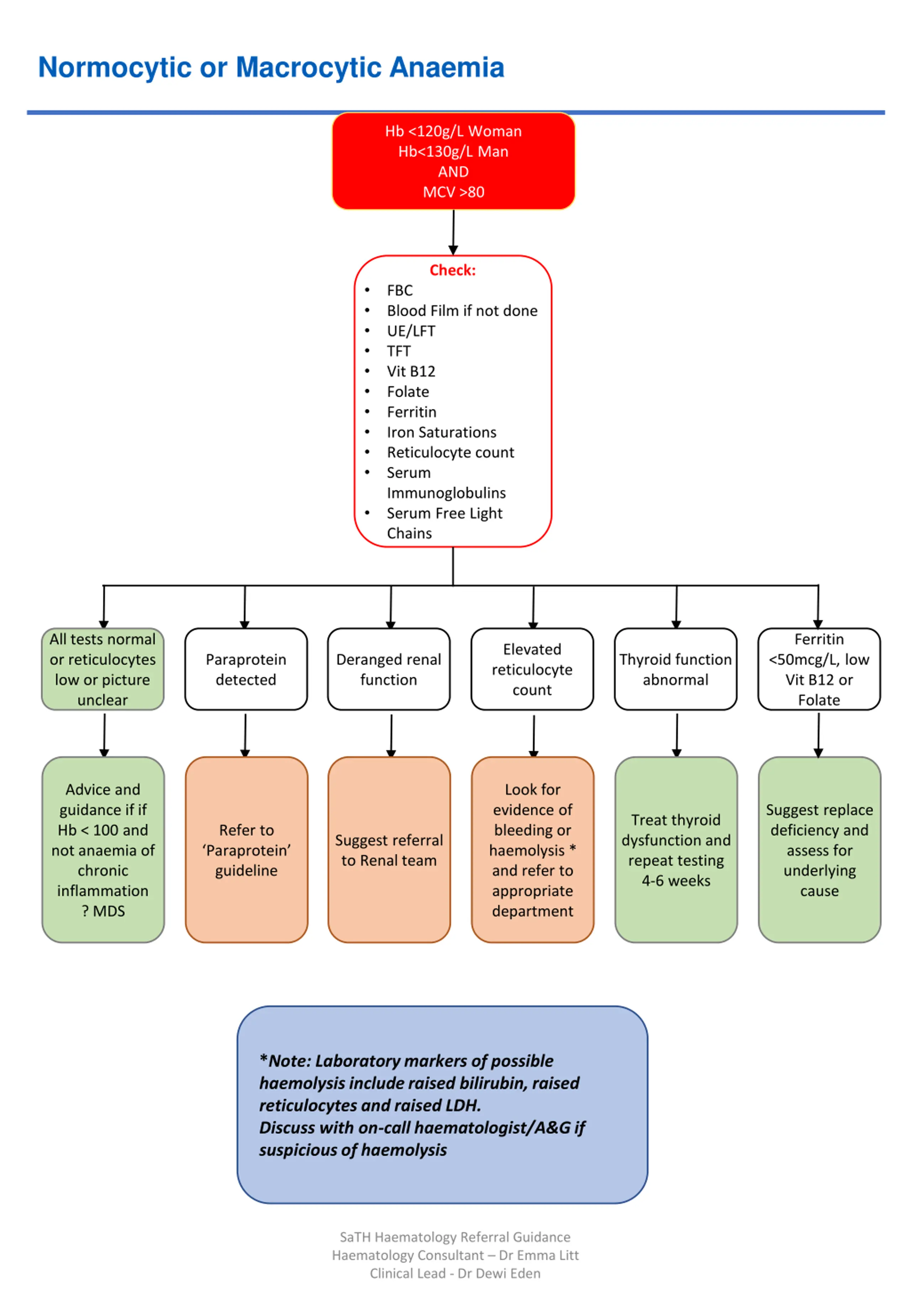 Normocytic or Macrocytic Anaemia Hb <120g/L Woman Hb<130g/L Man AND MCV >80 Check: FBC Blood Film if not done UE/LFT TFT Vit B12 Folate Ferritin Iron Saturations Reticulocyte count Serum Immunoglobulins Serum Free Light Chains All tests normal or reticulocytes low or picture unclear Ferritin <50mcg/L, low Vit B12 or Folate Elevated reticulocyte count Paraprotein detected Deranged renal function Thyroid function abnormal Advice and guidance if if Hb < 100 and not anaemia of chronic inflammation ? MDS Look for evidence of bleeding or haemolysis * and refer to appropriate department Suggest replace deficiency and assess for underlying cause Treat thyroid dysfunction and repeat testing 4-6 weeks Refer to Paraprotein guideline Suggest referral to Renal team *Note: Laboratory markers of possible haemolysis include raised bilirubin, raised reticulocytes and raised LDH. Discuss with on-call haematologist/A&G if suspicious of haemolysis SaTH Haematology Referral Guidance Haematology Consultant Dr Emma Litt Clinical Lead - Dr Dewi Eden