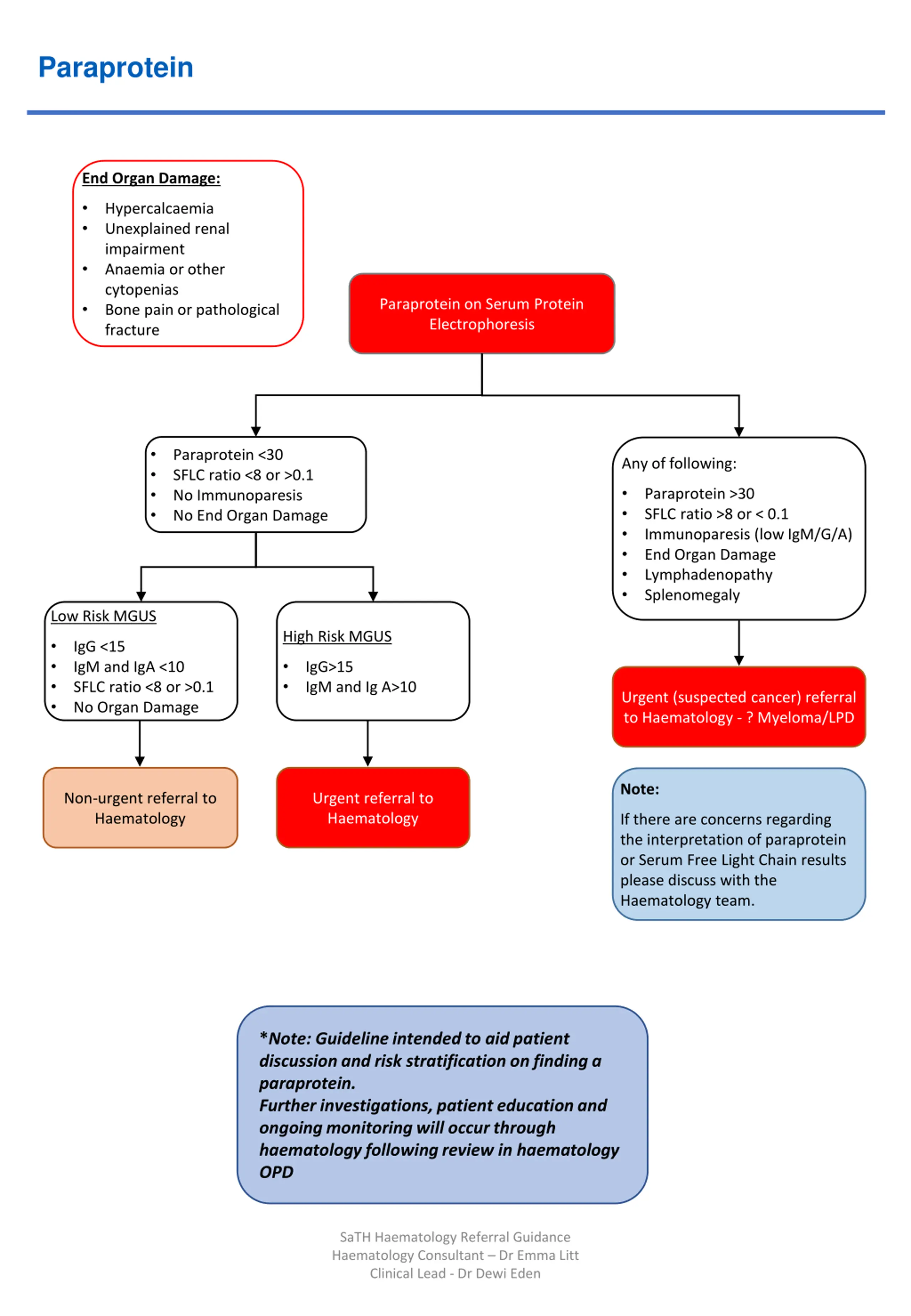 Paraprotein End Organ Damage: Hypercalcaemia Unexplained renal impairment Anaemia or other cytopenias Bone pain or pathological fracture Paraprotein on Serum Protein Electrophoresis Paraprotein <30 SFLC ratio <8 or >0.1 No Immunoparesis No End Organ Damage Any of following: Paraprotein >30 SFLC ratio >8 or < 0.1 Immunoparesis (low IgM/G/A) End Organ Damage Lymphadenopathy Splenomegaly Low Risk MGUS High Risk MGUS IgG <15 IgM and IgA <10 SFLC ratio <8 or >0.1 No Organ Damage IgG>15 IgM and Ig A>10 Urgent (suspected cancer) referral to Haematology - ? Myeloma/LPD Note: Urgent referral to Haematology Non-urgent referral to Haematology If there are concerns regarding the interpretation of paraprotein or Serum Free Light Chain results please discuss with the Haematology team. *Note: Guideline intended to aid patient discussion and risk stratification on finding a paraprotein. Further investigations, patient education and ongoing monitoring will occur through haematology following review in haematology OPD SaTH Haematology Referral Guidance Haematology Consultant Dr Emma Litt Clinical Lead - Dr Dewi Eden