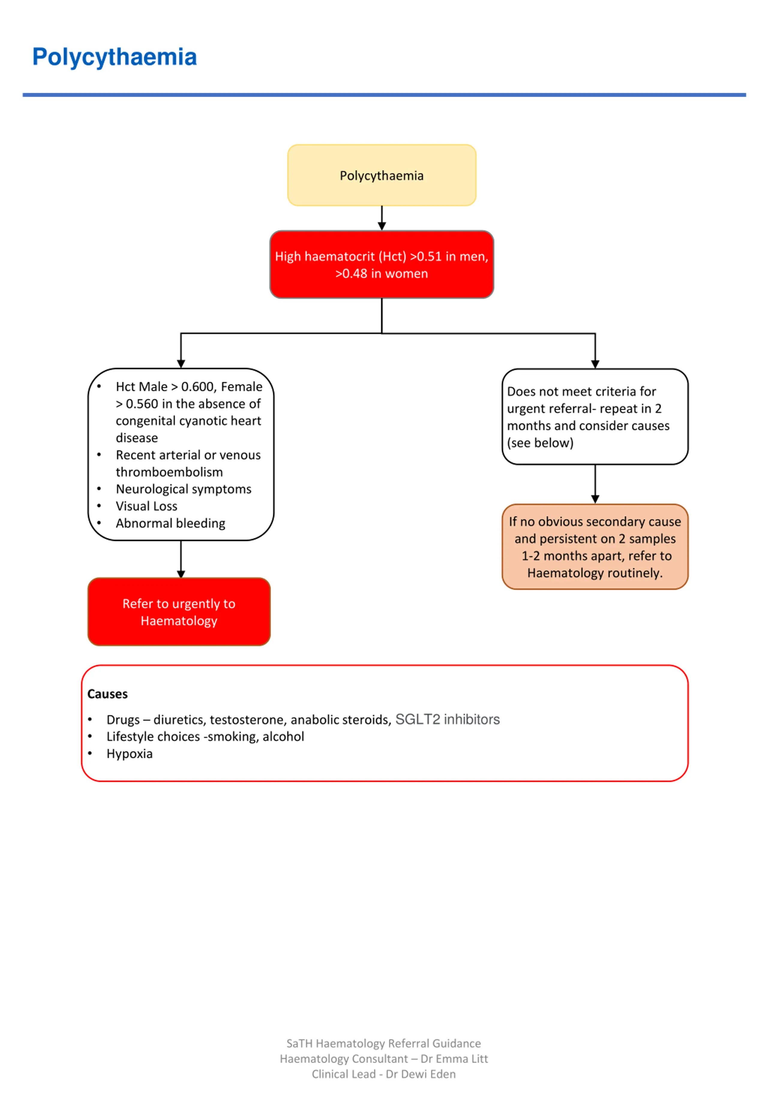 Polycythaemia Polycythaemia High haematocrit (Hct) >0.51 in men, >0.48 in women Hct Male > 0.600, Female > 0.560 in the absence of congenital cyanotic heart disease Recent arterial or venous thromboembolism Neurological symptoms Visual Loss Abnormal bleeding Does not meet criteria for urgent referral- repeat in 2 months and consider causes (see below) If no obvious secondary cause and persistent on 2 samples 1-2 months apart, refer to Haematology routinely. Refer to urgently to Haematology Causes Drugs diuretics, testosterone, anabolic steroids, SGLT2 inhibitors Lifestyle choices -smoking, alcohol Hypoxia SaTH Haematology Referral Guidance Haematology Consultant Dr Emma Litt Clinical Lead - Dr Dewi Eden