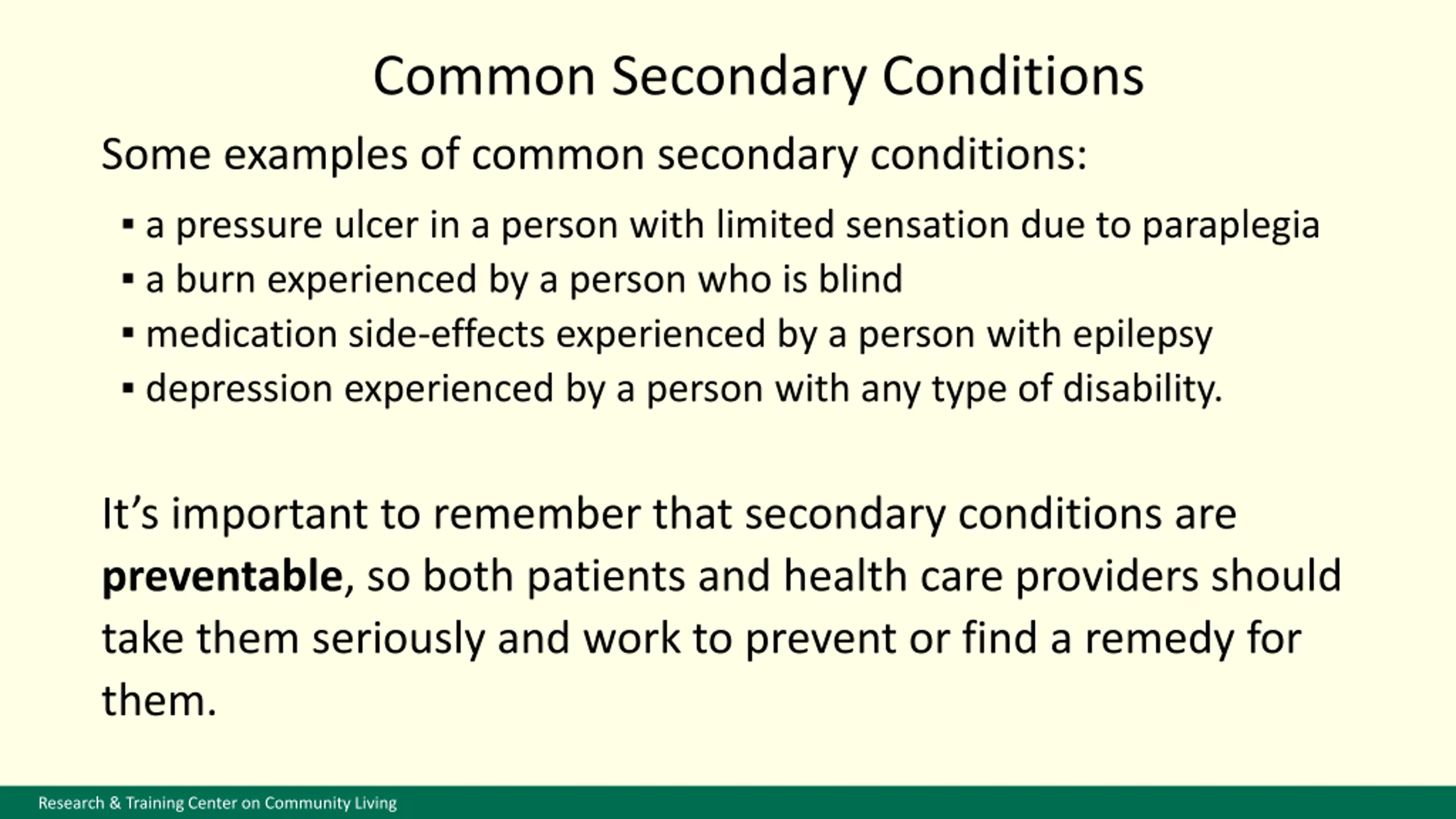 Secondary Conditions People with disabilities often are at greater risk for health problems that can be prevented. As a result of having a disability, such as a spinal cord injury, blindness, or epilepsy, an additional physical or mental health condition can occur. Sometimes these conditions are more serious or life-threatening then the primary disability. Research & Training Center on Community Living