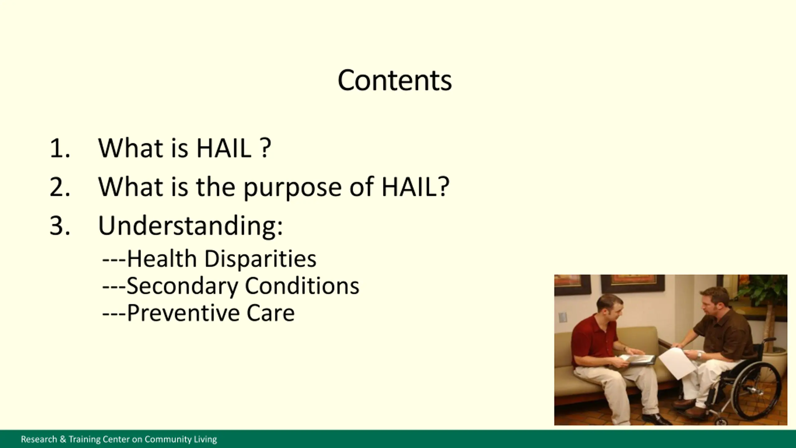 Contents 1. What is HAIL ? 2. What is the purpose of HAIL? 3. Understanding: ---Health Disparities ---Secondary Conditions ---Preventive Care Research & Training Center on Community Living