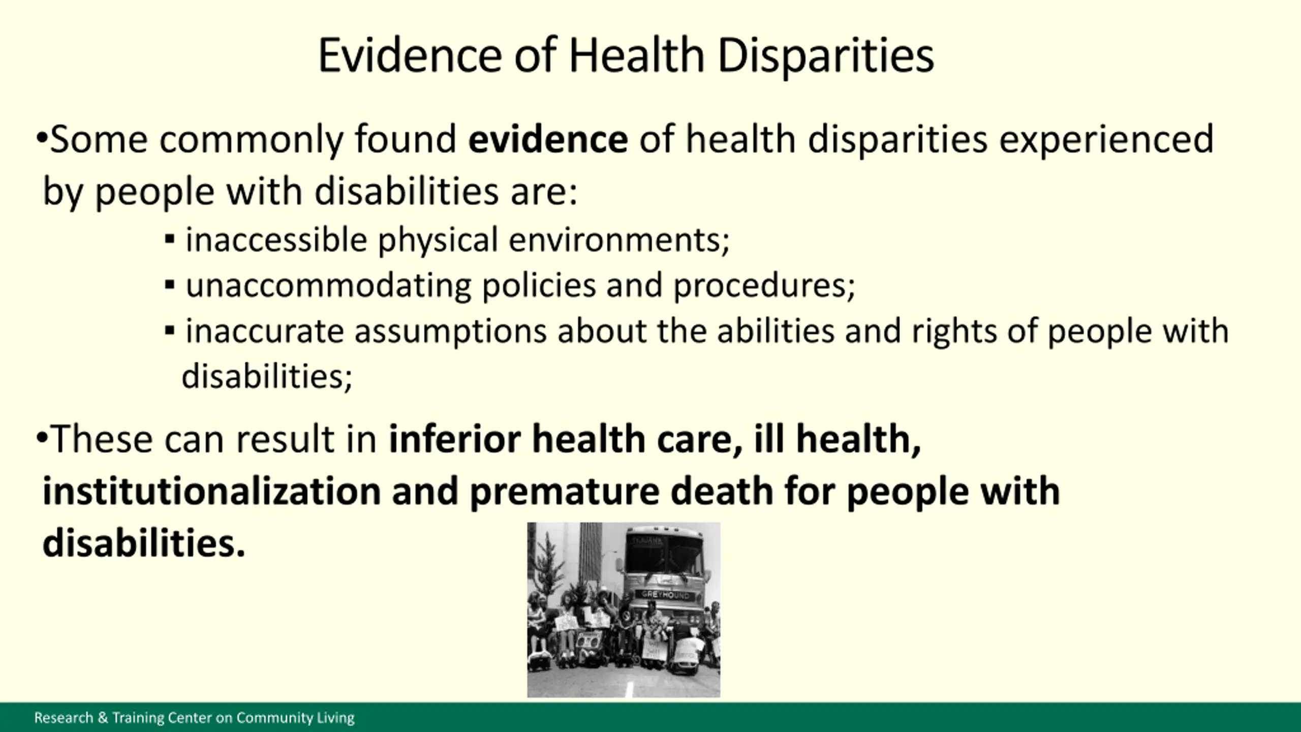 Evidence of Health Disparities Some commonly found evidence of health disparities experienced by people with disabilities are: inaccessible physical environments; unaccommodating policies and procedures; inaccurate assumptions about the abilities and rights of people with disabilities; These can result in inferior health care, ill health, institutionalization and premature death for people with disabilities. Research & Training Center on Community Living