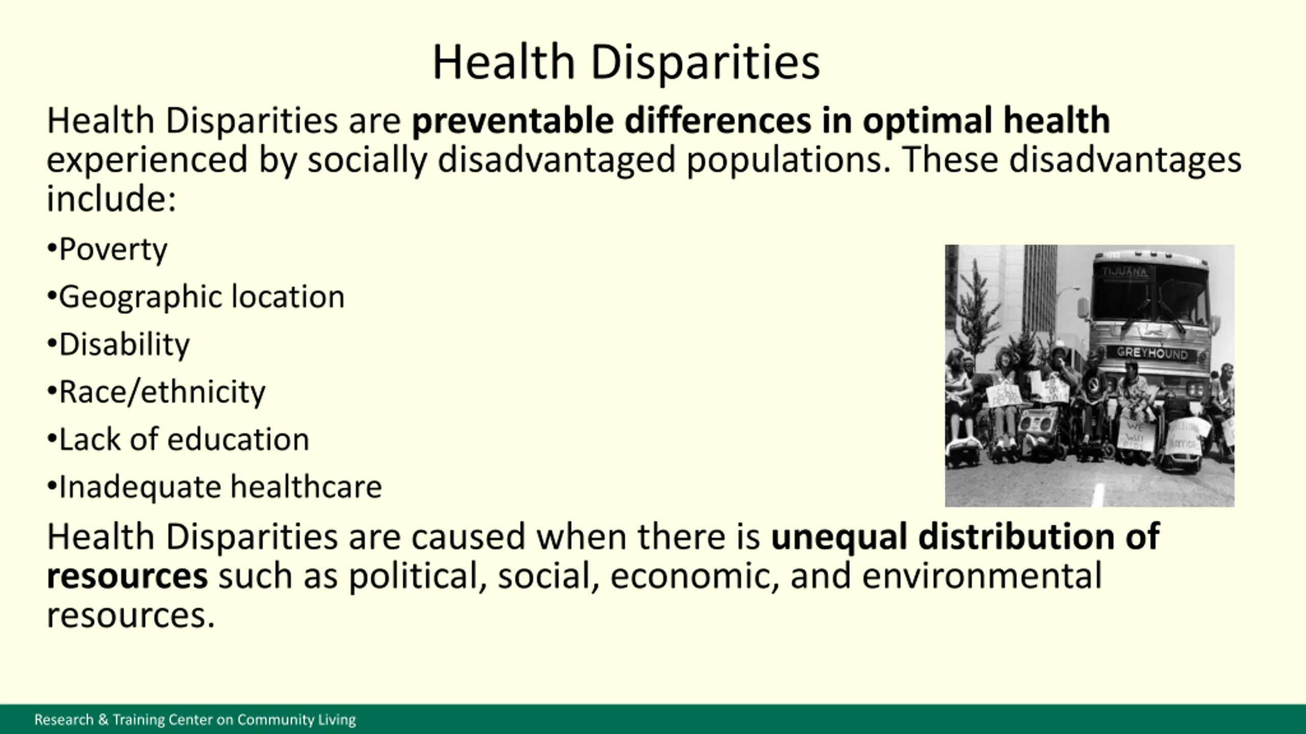 Health Disparities Health Disparities are preventable differences in optimal health experienced by socially disadvantaged populations. These disadvantages include: Poverty Geographic location Disability Race/ethnicity Lack of education Inadequate healthcare Health Disparities are caused when there is unequal distribution of resources such as political, social, economic, and environmental resources. Research & Training Center on Community Living