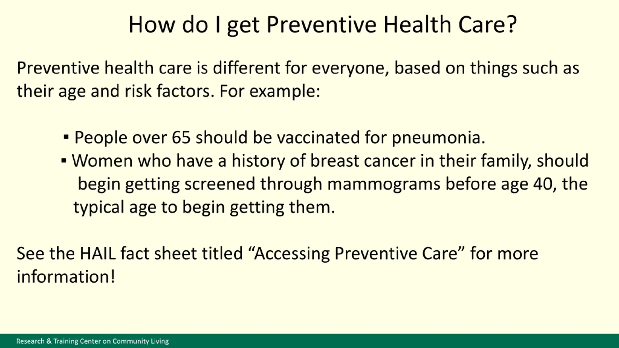 How do I get Preventive Health Care? Preventive health care is different for everyone, based on things such as their age and risk factors. For example: Women who have a history of breast cancer in their family, should begin getting screened through mammograms before age 40, the typical age to begin getting them. People over 65 should be vaccinated for pneumonia. See the HAIL fact sheet titled Accessing Preventive Care for more information! Research & Training Center on Community Living