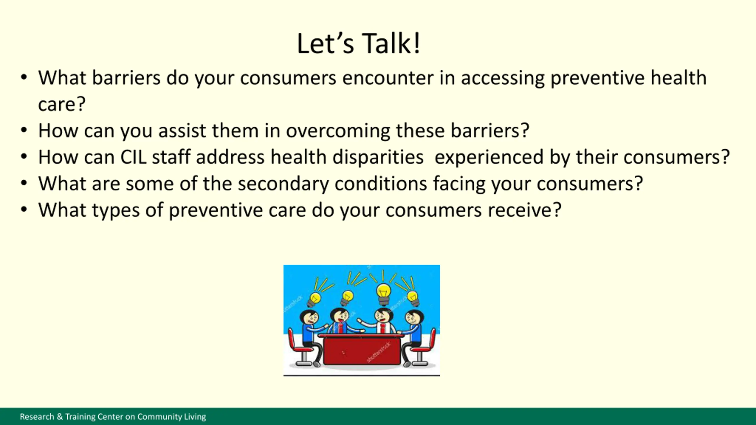 Lets Talk! What barriers do your consumers encounter in accessing preventive health care? How can you assist them in overcoming these barriers? How can CIL staff address health disparities experienced by their consumers? What are some of the secondary conditions facing your consumers? What types of preventive care do your consumers receive? Research & Training Center on Community Living