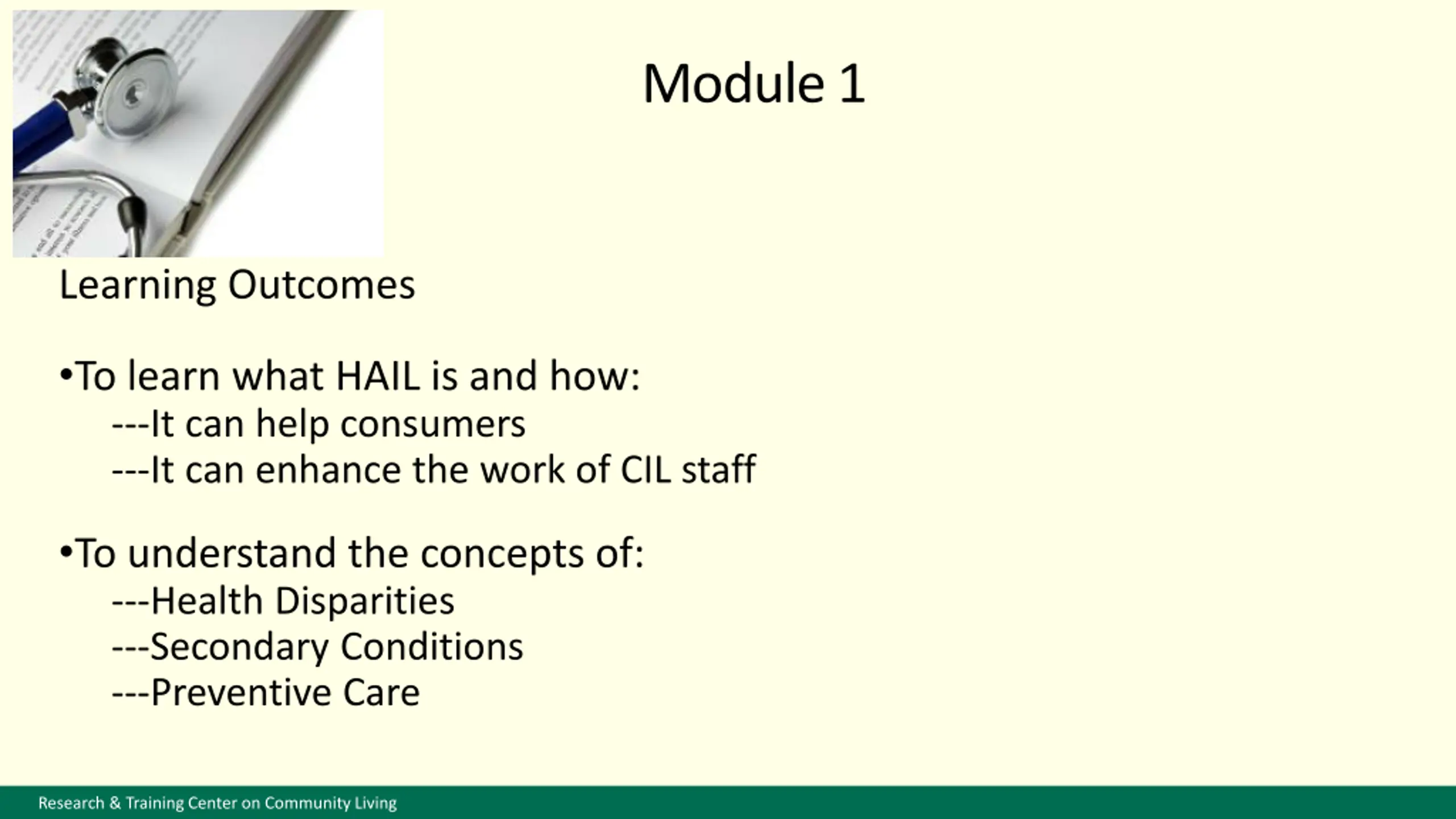 Module 1 Learning Outcomes To learn what HAIL is and how: ---It can help consumers ---It can enhance the work of CIL staff To understand the concepts of: ---Health Disparities ---Secondary Conditions ---Preventive Care Research & Training Center on Community Living