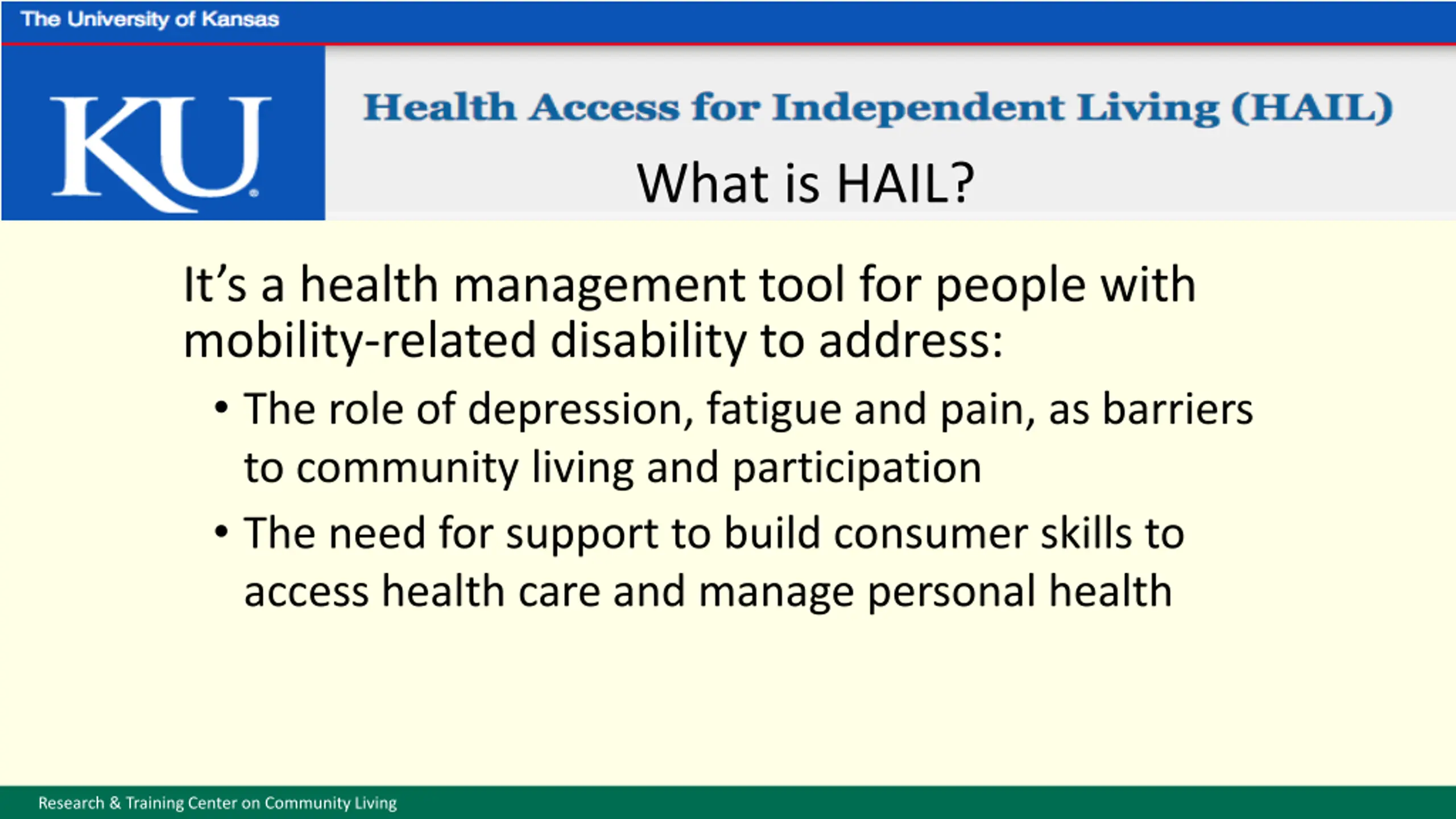 What is HAIL? It s a health management tool for people with mobility-related disability to address: The role of depression, fatigue and pain, as barriers to community living and participation The need for support to build consumer skills to access health care and manage personal health Research & Training Center on Community Living