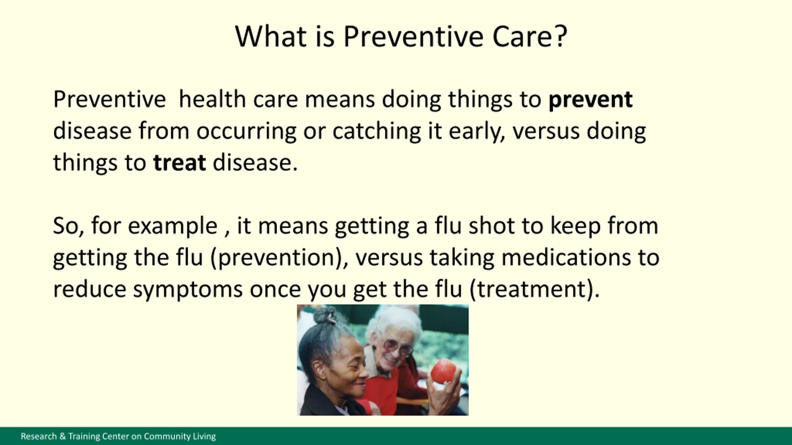 What is Preventive Care? Preventive health care means doing things to prevent disease from occurring or catching it early, versus doing things to treat disease. So, for example , it means getting a flu shot to keep from getting the flu (prevention), versus taking medications to reduce symptoms once you get the flu (treatment). Research & Training Center on Community Living