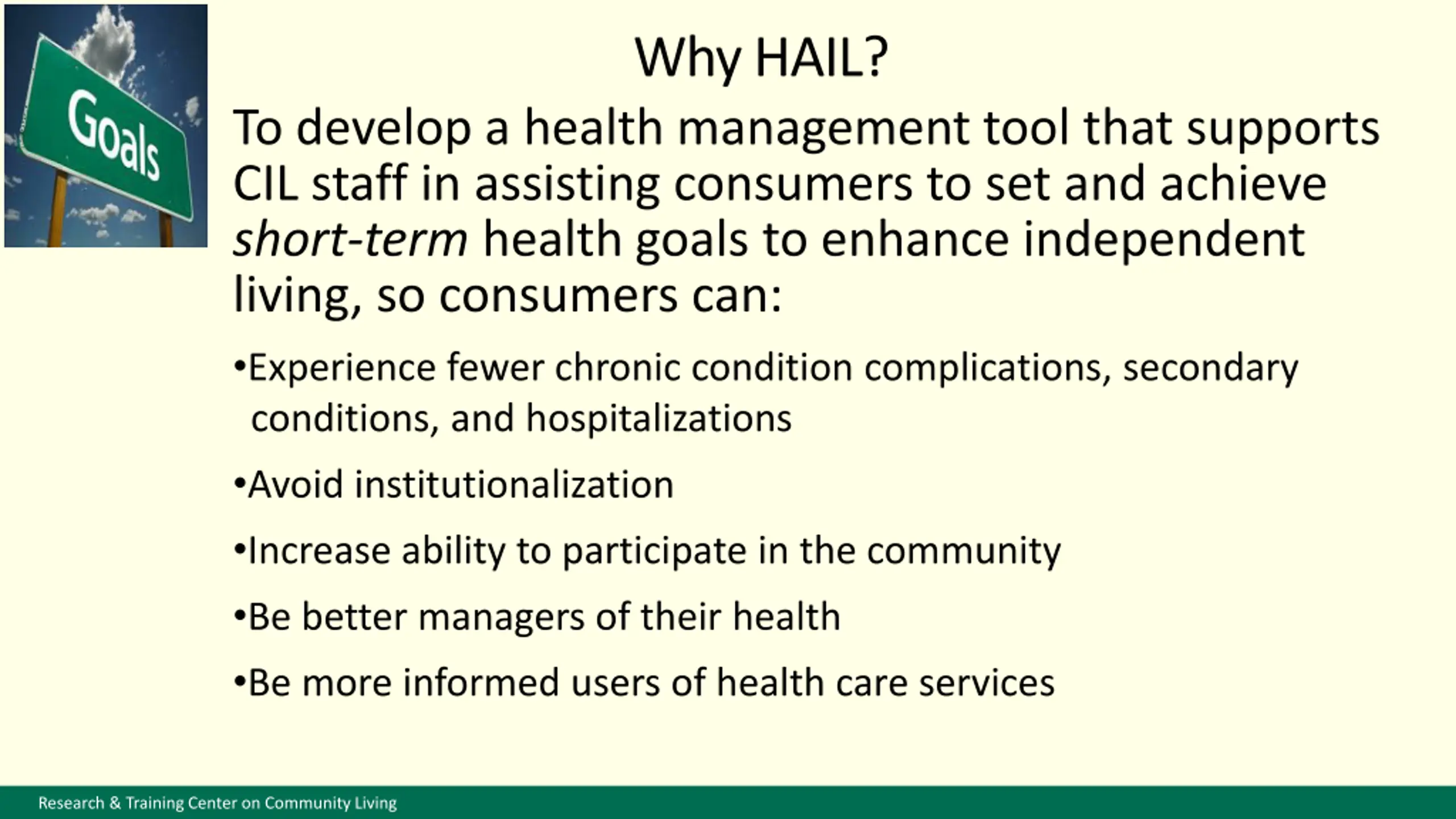 Why HAIL? To develop a health management tool that supports CIL staff in assisting consumers to set and achieve short-term health goals to enhance independent living, so consumers can: Experience fewer chronic condition complications, secondary conditions, and hospitalizations Avoid institutionalization Increase ability to participate in the community Be better managers of their health Be more informed users of health care services Research & Training Center on Community Living