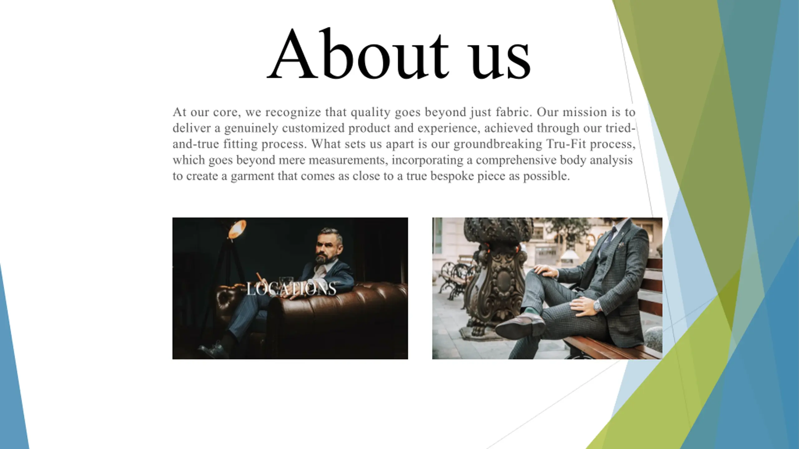 About us At our core, we recognize that quality goes beyond just fabric. Our mission is to deliver a genuinely customized product and experience, achieved through our tried- and-true fitting process. What sets us apart is our groundbreaking Tru-Fit process, which goes beyond mere measurements, incorporating a comprehensive body analysis to create a garment that comes as close to a true bespoke piece as possible.