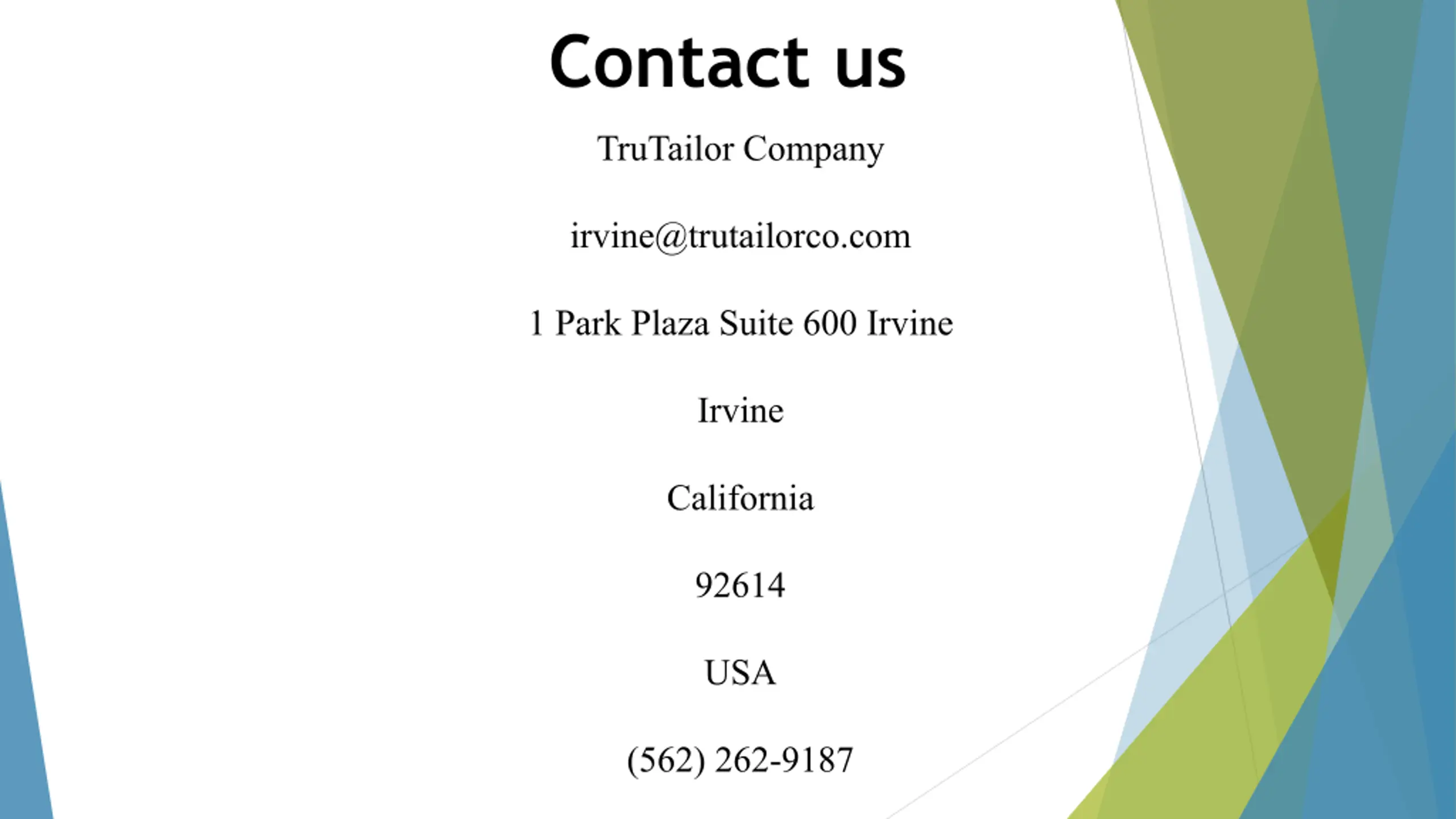 Contact us TruTailor Company irvine@trutailorco.com 1 Park Plaza Suite 600 Irvine Irvine California 92614 USA (562) 262-9187