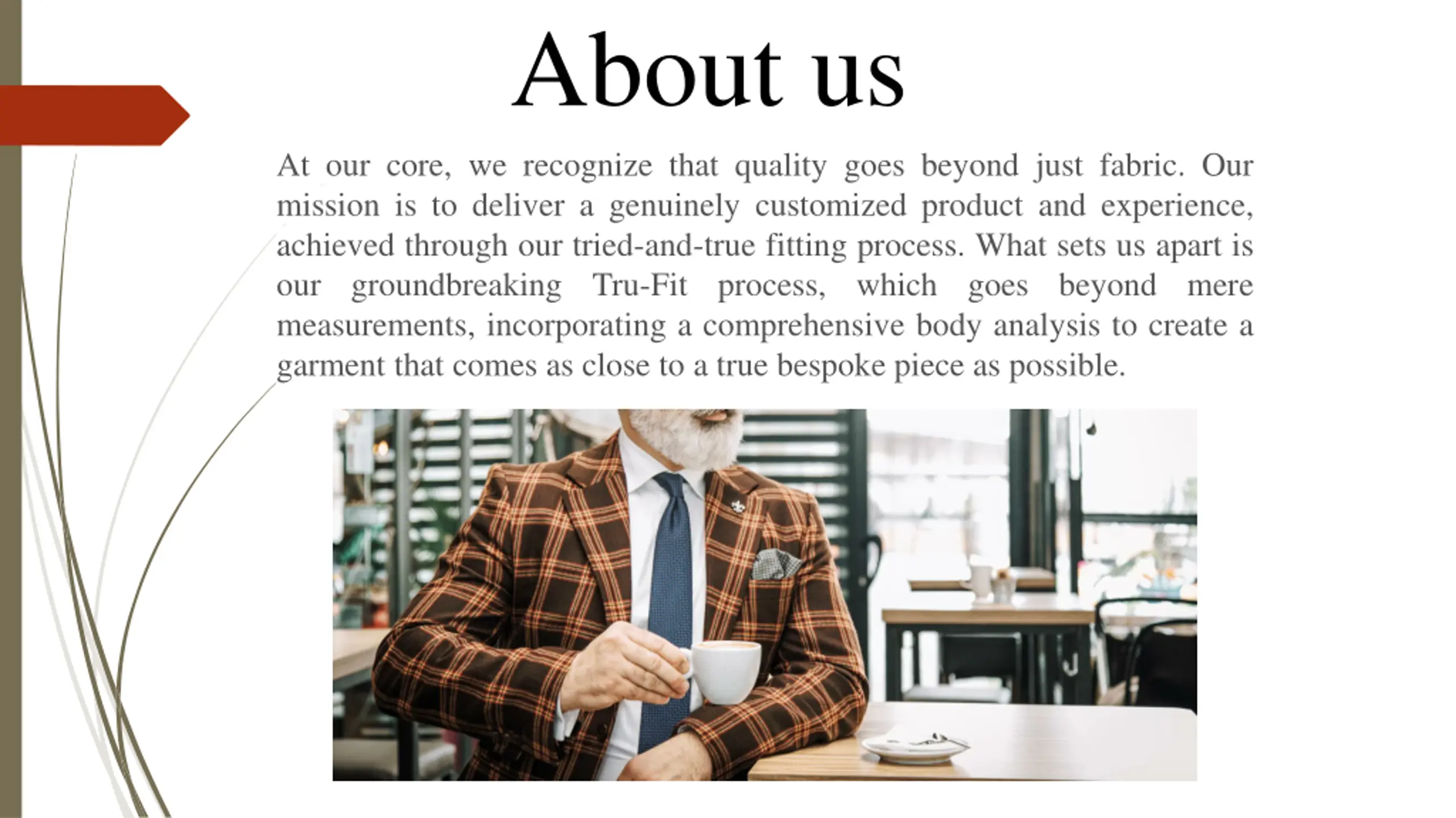 About us At our core, we recognize that quality goes beyond just fabric. Our mission is to deliver a genuinely customized product and experience, achieved through our tried-and-true fitting process. What sets us apart is our groundbreaking Tru-Fit process, which measurements, incorporating a comprehensive body analysis to create a garment that comes as close to a true bespoke piece as possible. goes beyond mere