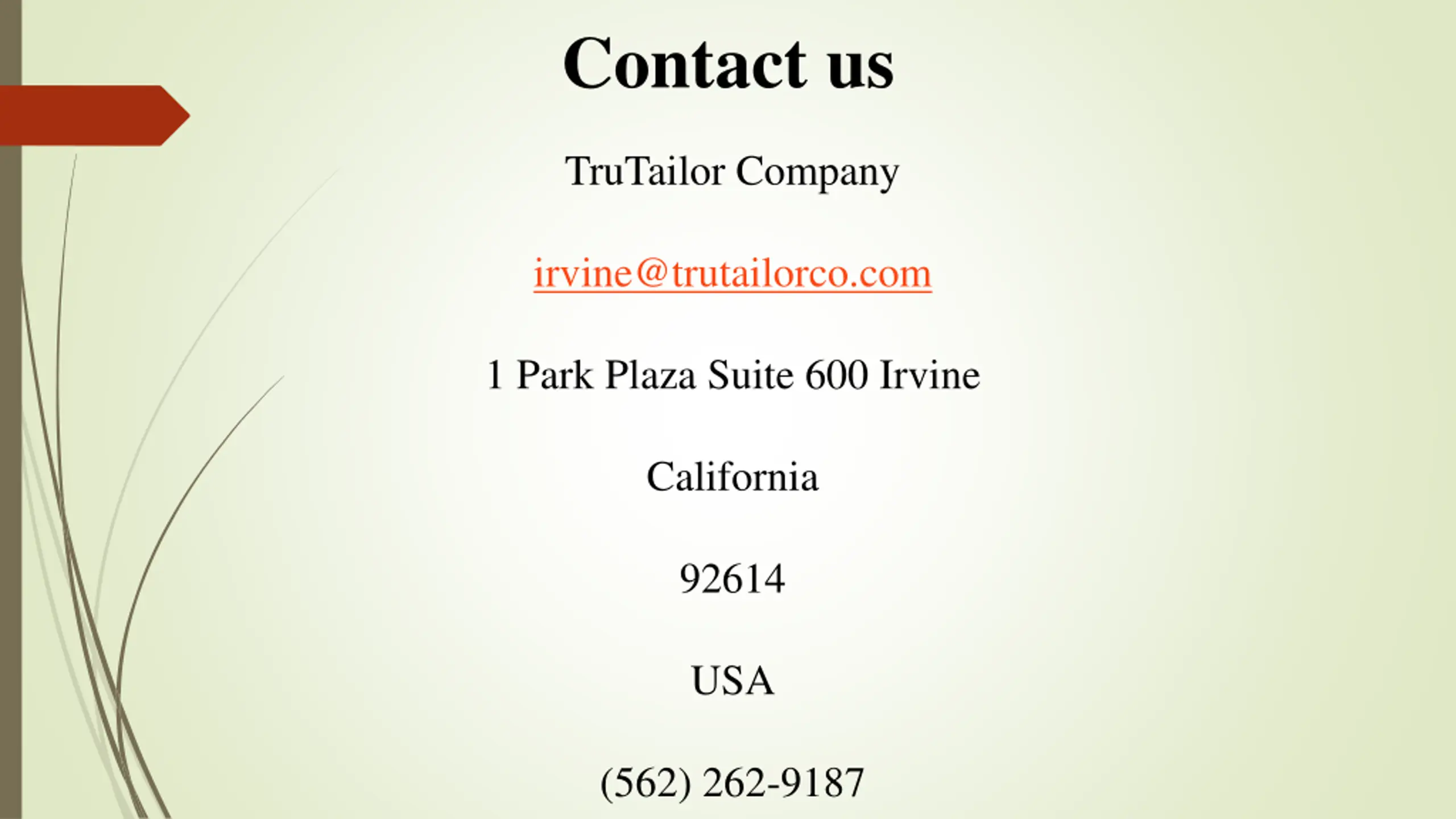 Contact us TruTailor Company irvine@trutailorco.com 1 Park Plaza Suite 600 Irvine California 92614 USA (562) 262-9187