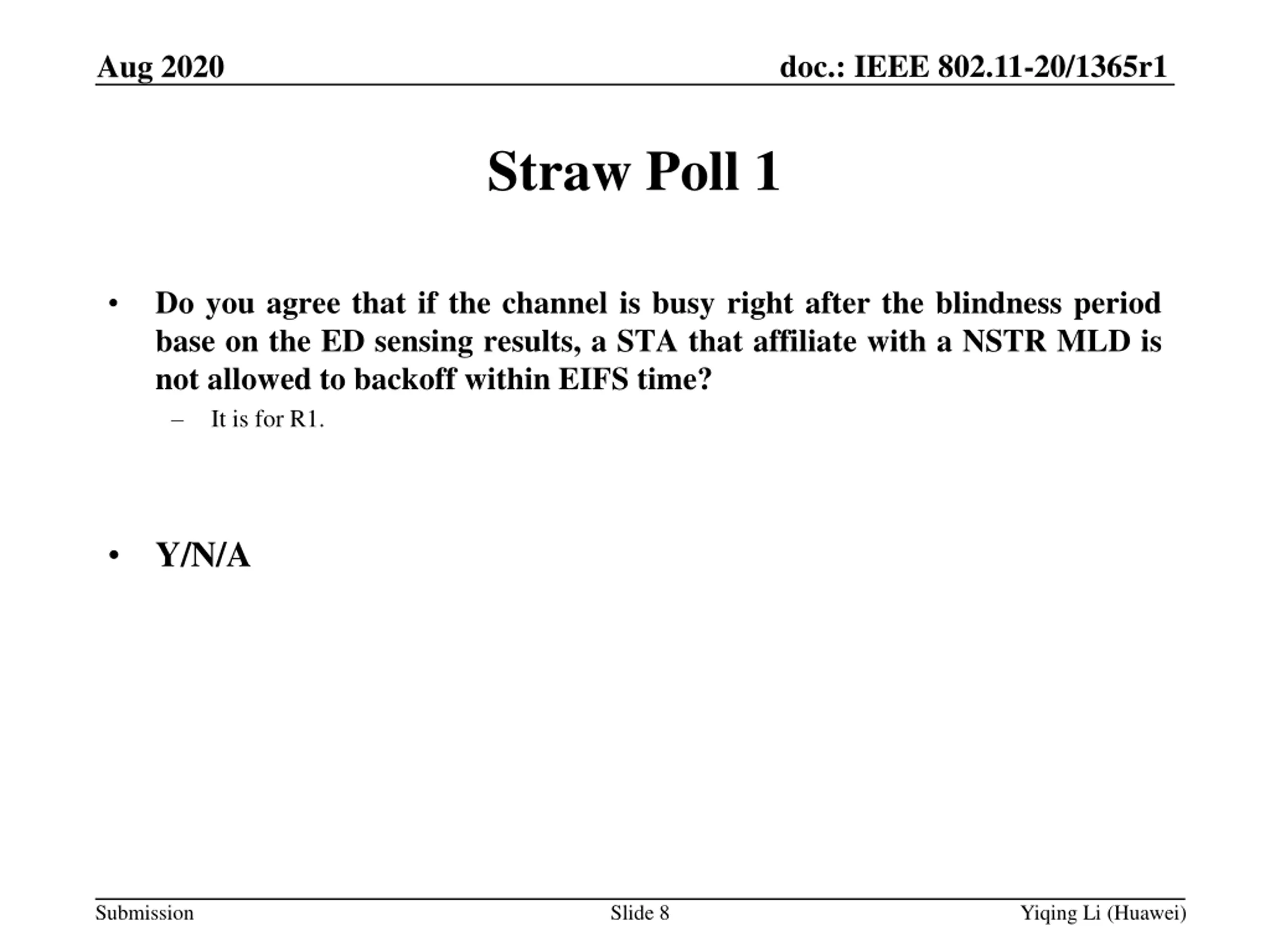 doc.: IEEE 802.11-20/1365r1 Aug 2020 Straw Poll 1 Do you agree that if the channel is busy right after the blindness period base on the ED sensing results, a STA that affiliate with a NSTR MLD is not allowed to backoff within EIFS time? It is for R1. Y/N/A Submission Slide 8 Yiqing Li (Huawei)