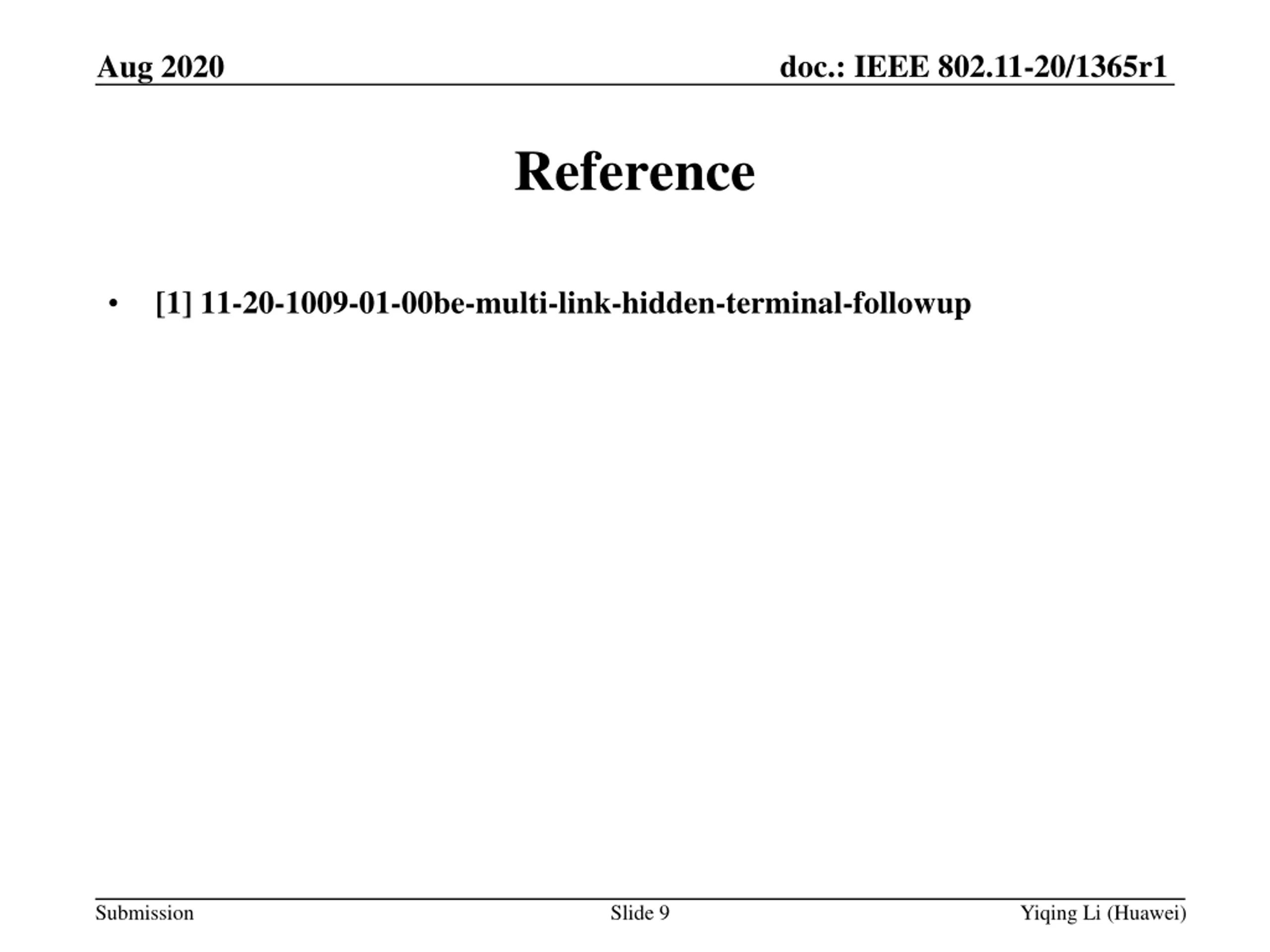 doc.: IEEE 802.11-20/1365r1 Aug 2020 Reference [1] 11-20-1009-01-00be-multi-link-hidden-terminal-followup Submission Slide 9 Yiqing Li (Huawei)