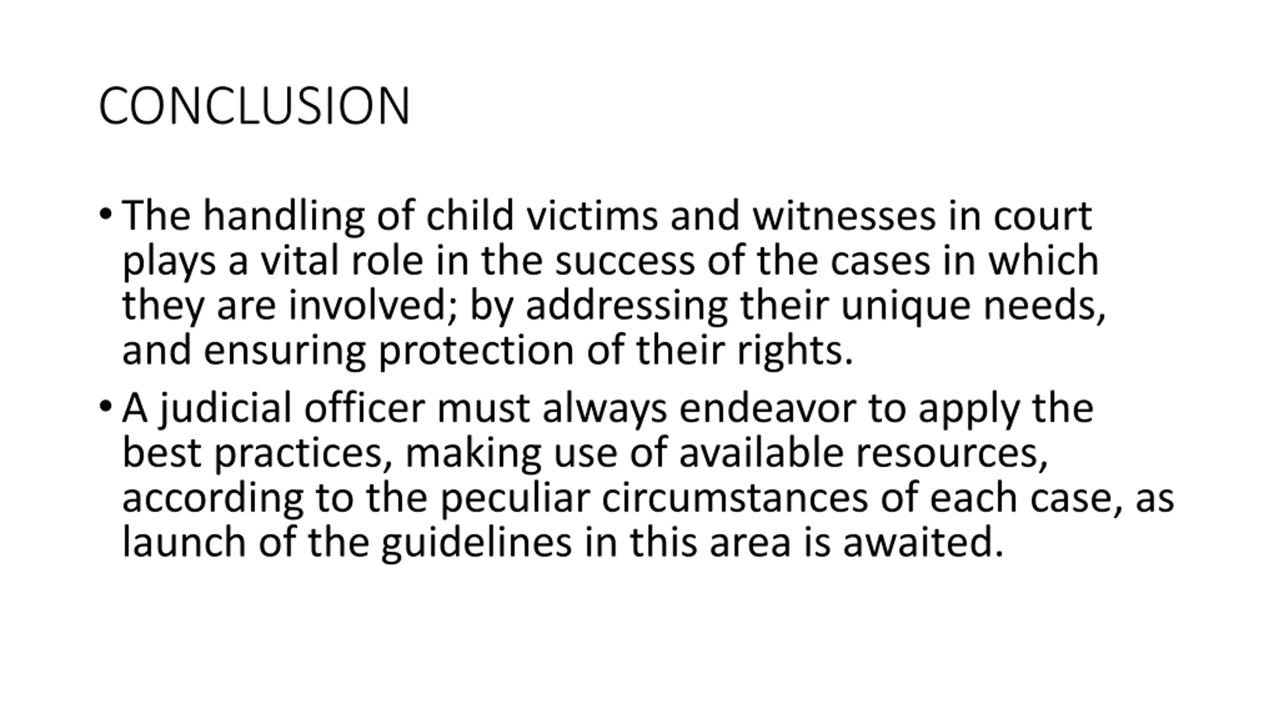 CONCLUSION The handling of child victims and witnesses in court plays a vital role in the success of the cases in which they are involved; by addressing their unique needs, and ensuring protection of their rights. A judicial officer must always endeavor to apply the best practices, making use of available resources, according to the peculiar circumstances of each case, as launch of the guidelines in this area is awaited.