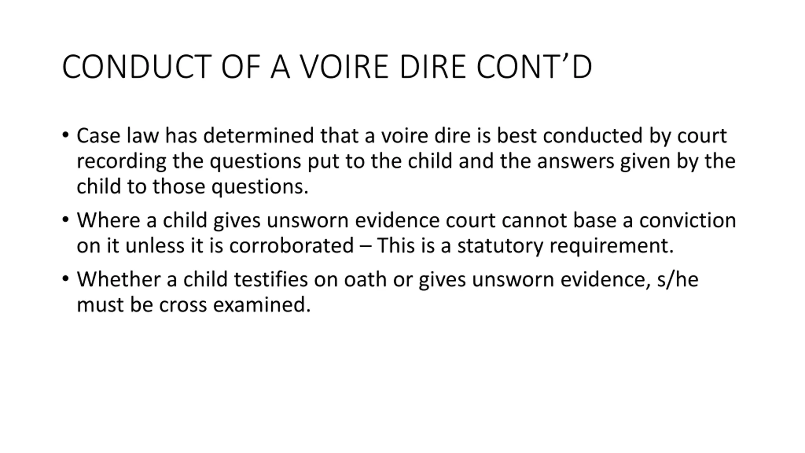 CONDUCT OF A VOIRE DIRE CONTD Case law has determined that a voire dire is best conducted by court recording the questions put to the child and the answers given by the child to those questions. Where a child gives unsworn evidence court cannot base a conviction on it unless it is corroborated This is a statutory requirement. Whether a child testifies on oath or gives unsworn evidence, s/he must be cross examined.