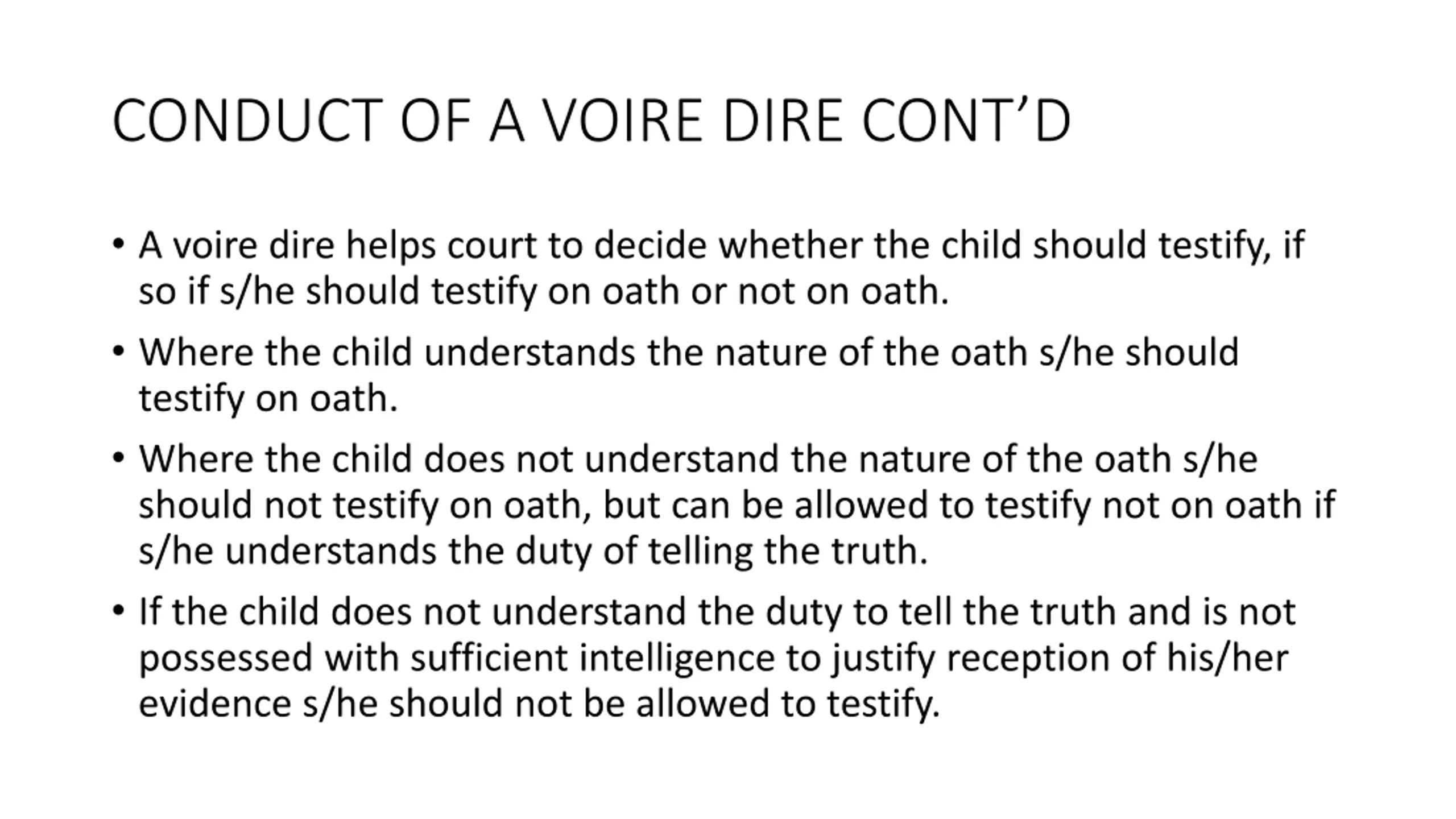 CONDUCT OF A VOIRE DIRE In cases of young children the voire dire is a good opportunity for court to develop rapport with the child victim/witness. Court must conduct a voire dire before a child of tender years (a child below 14 years) testifies, for the purpose of determining whether: - The child understands the nature of the oath; or - The child understands the duty of telling the truth; and - The child is possessed with sufficient intelligence to justify the reception of his/her evidence.