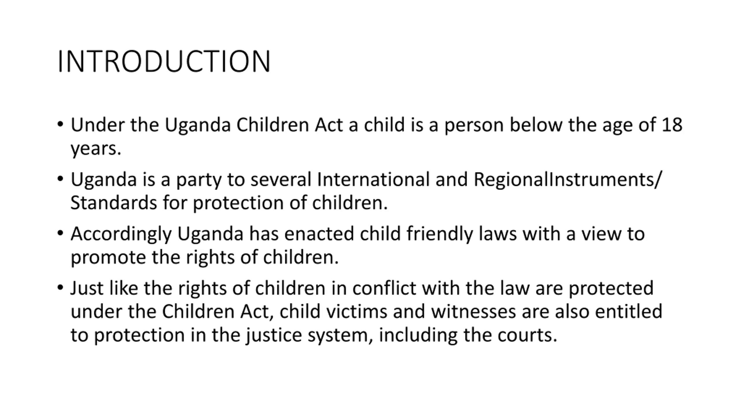 INTRODUCTION Under the Uganda Children Act a child is a person below the age of 18 years. Uganda is a party to several International and RegionalInstruments/ Standards for protection of children. Accordingly Uganda has enacted child friendly laws with a view to promote the rights of children. Just like the rights of children in conflict with the law are protected under the Children Act, child victims and witnesses are also entitled to protection in the justice system, including the courts.